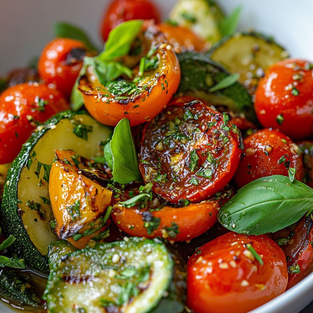 • Add the cherry tomatoes, zucchini, and bell pepper to the skillet. Sauté for about 5-7 minutes until the vegetables are tender but still vibrant.