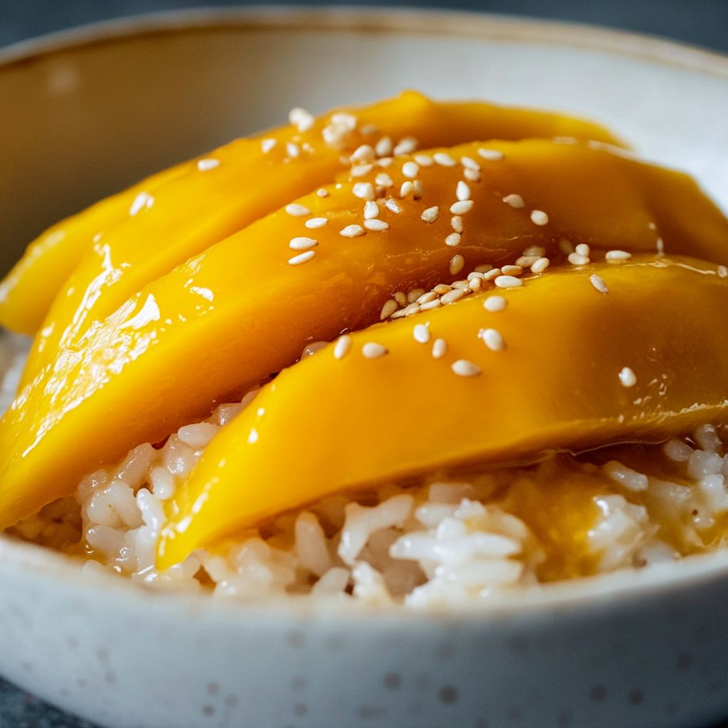 Mango Sticky Rice is best served by placing a portion of sticky rice on a plate, drizzling it with the coconut sauce, and topping with slices of fresh mango. You can also garnish it with toasted sesame seeds or mung beans for added texture.