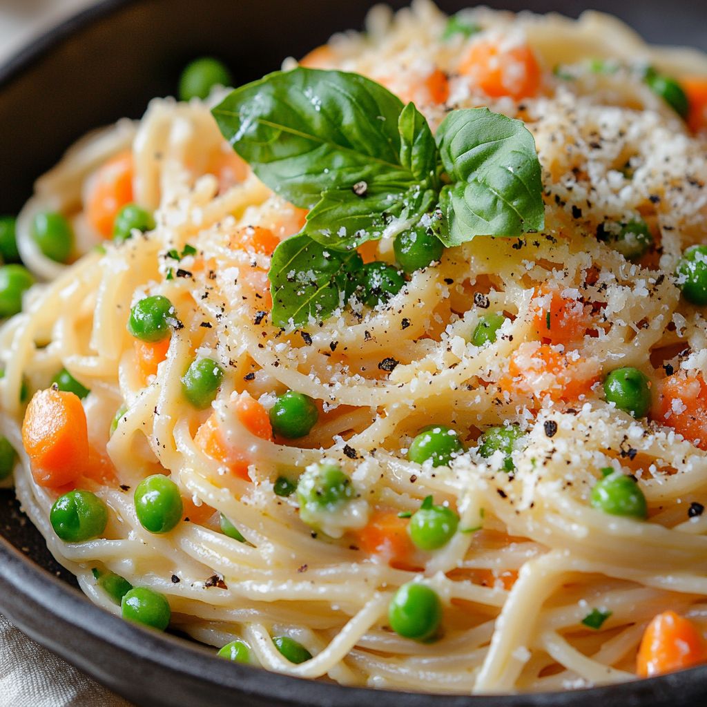 Carrot & Pea Primavera is a vibrant dish made with fresh carrots, peas, and a variety of vegetables typically tossed in olive oil and seasonings to highlight their natural flavors. It is often served over pasta or as a standalone dish.