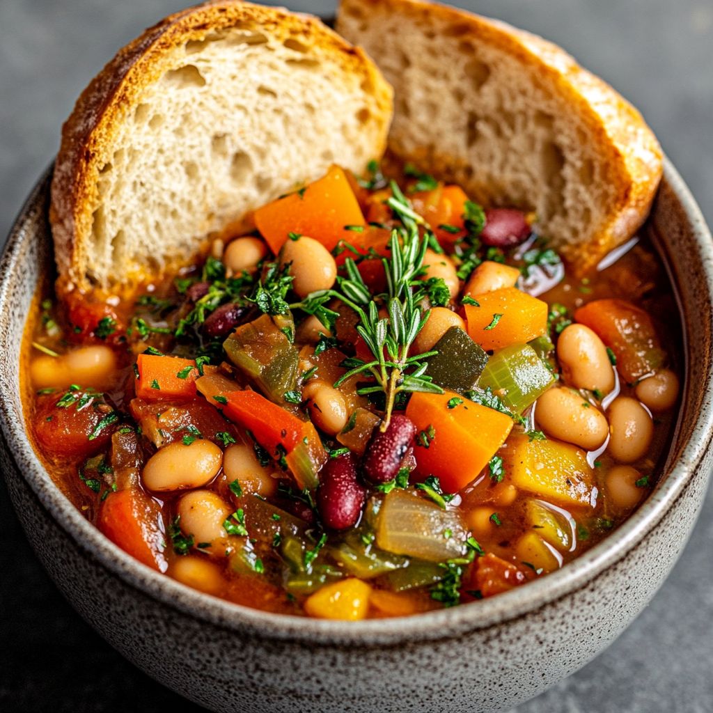 The main ingredients include mixed vegetables such as carrots, bell peppers, and zucchini, canned beans (like kidney and black beans), vegetable broth, tomatoes, onions, garlic, and your choice of herbs and spices. Don’t forget the crusty bread for serving!