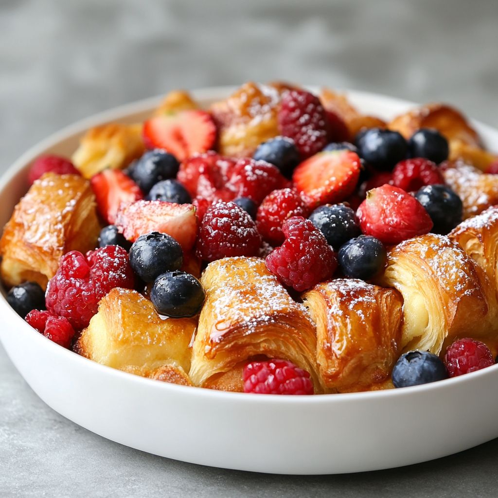→ Pouring the custard mixture evenly over the croissant pieces ensures each chunk has time to soak up the custard flavor. Use a spatula to gently press down on the croissants if necessary, allowing them to absorb the liquid. - Sprinkle the mixed berries evenly across the top of the custard-coated croissants.