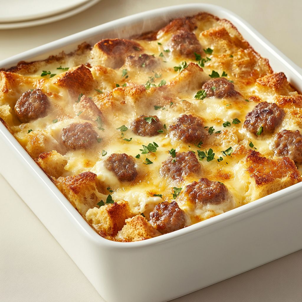 A warm, comforting baked breakfast dish that layers savory sausage, scrambled eggs, bread cubes, and melted cheese. It’s easy to prepare ahead and feeds a crowd.