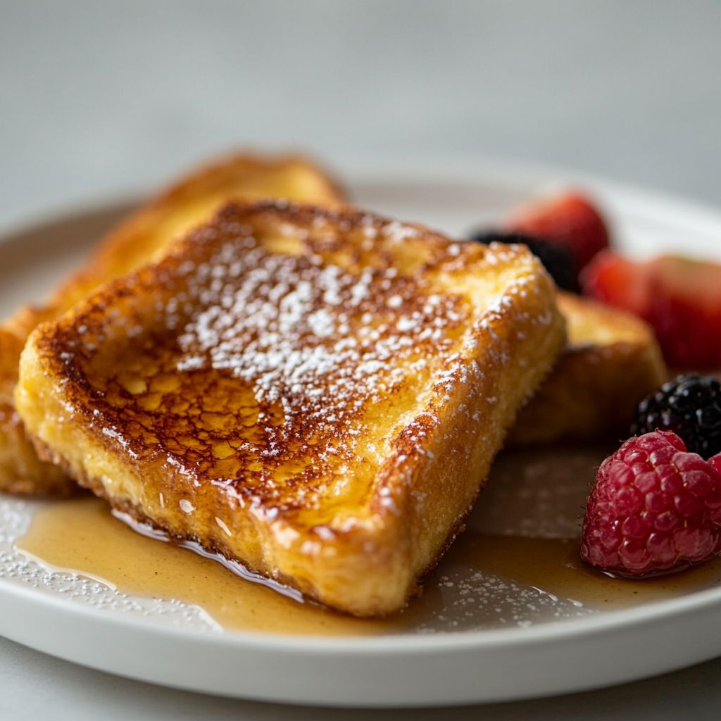 • Serve the brûléed French toast immediately while the top remains crisp; drizzle with pure maple syrup and garnish with fresh berries or sliced fruit for brightness, offering a contrast to the rich custard.