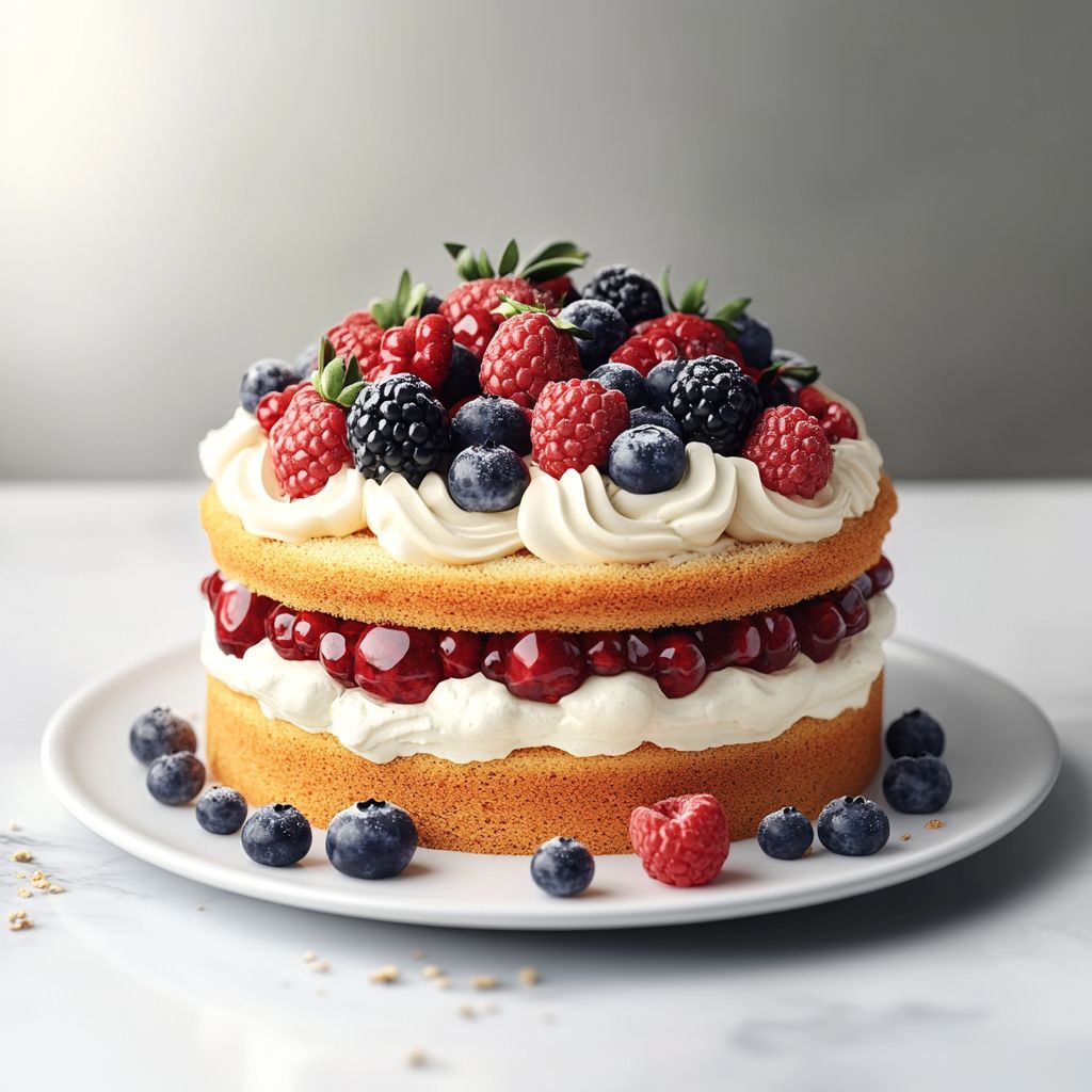 A light, fluffy vanilla sponge layered with whipped cream and a lush berry filling, finished with fresh berries on top. Perfect for summer celebrations, birthdays, or any berry lovers’ dessert.