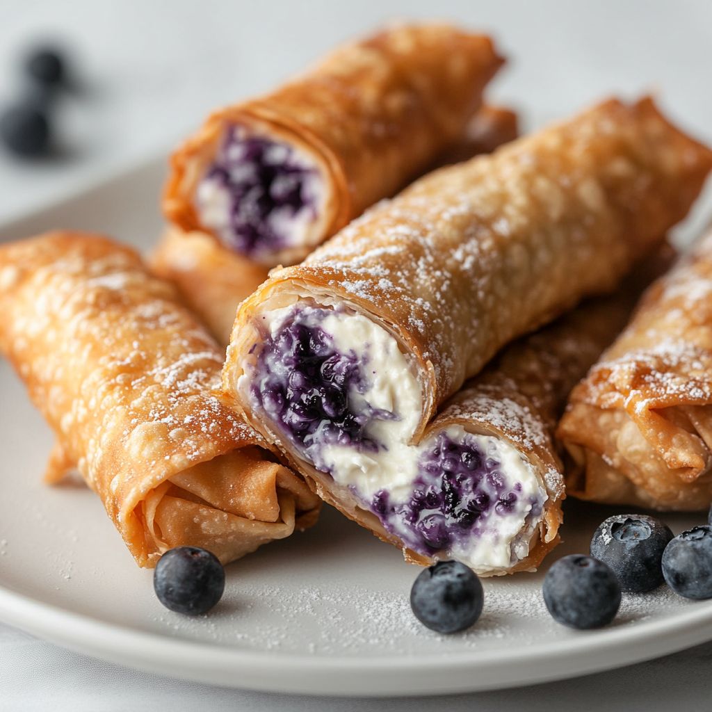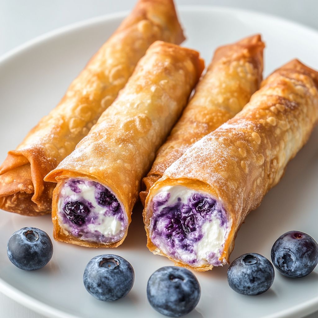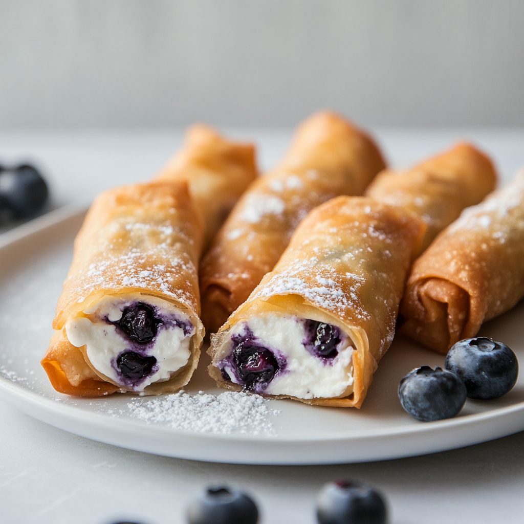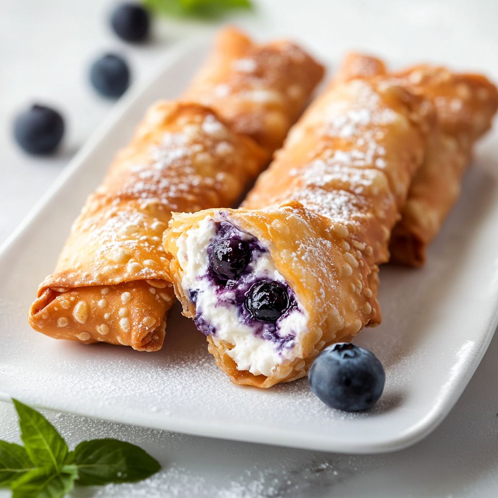 Blueberry Cream Cheese Egg Rolls are a sweet treat where a creamy mix of softened cream cheese and juicy blueberries is wrapped in an egg roll wrapper and fried or air-fried until the exterior is crisp and golden. They’re often served warm with a light dusting of powdered sugar or a fruit glaze.