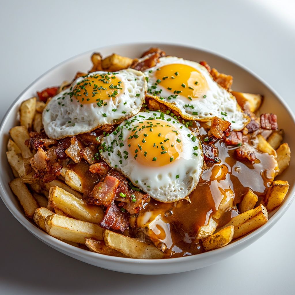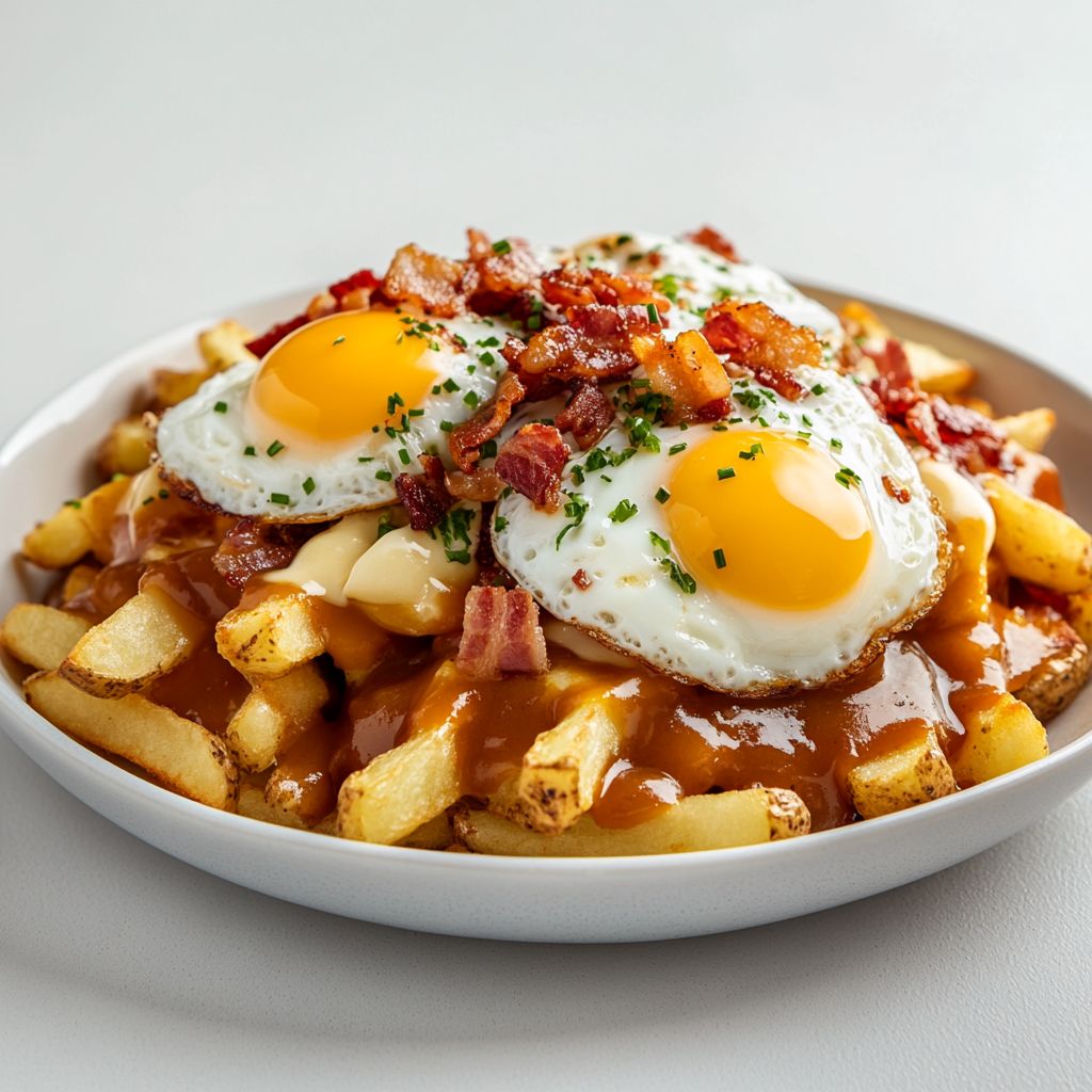 • Serve immediately with the yolk still runny (if chosen) and enjoy the layered textures of crisp fries, squeaky curds, saucy gravy, and luxurious eggs; encourage guests to mix gently for a creamy, cohesive bite.