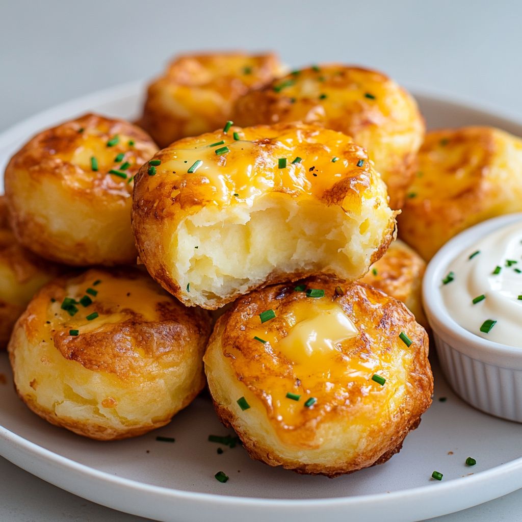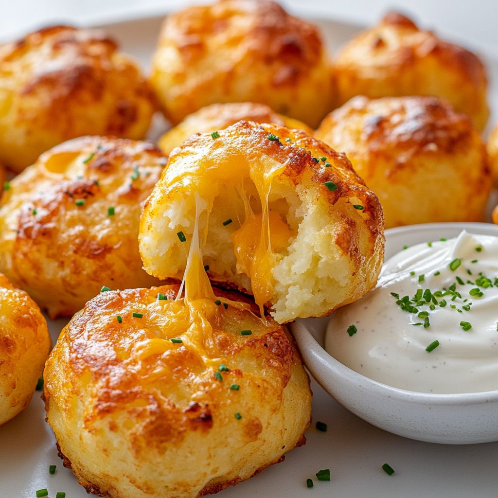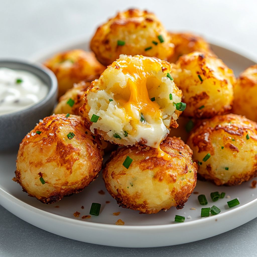 They’re bite-sized, savory nibbles made by mixing mashed potatoes with cheese and a binding agent, coating in breadcrumbs, and baking or air-frying until puffed, golden, and crispy on the outside with a melty cheesy center.