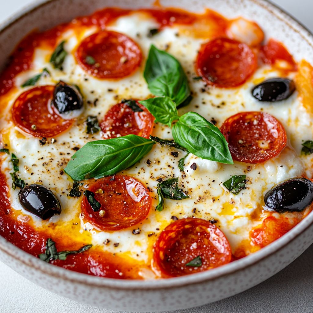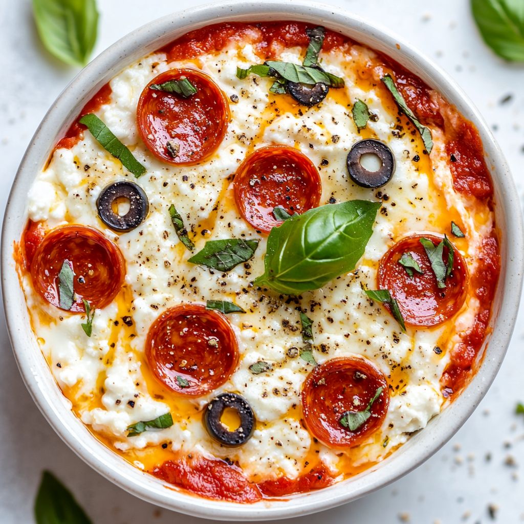 A quick, high-protein dish that uses seasoned cottage cheese as a pizza-flavored base, topped with mozzarella and customizable toppings, all served in a bowl—no dough required.