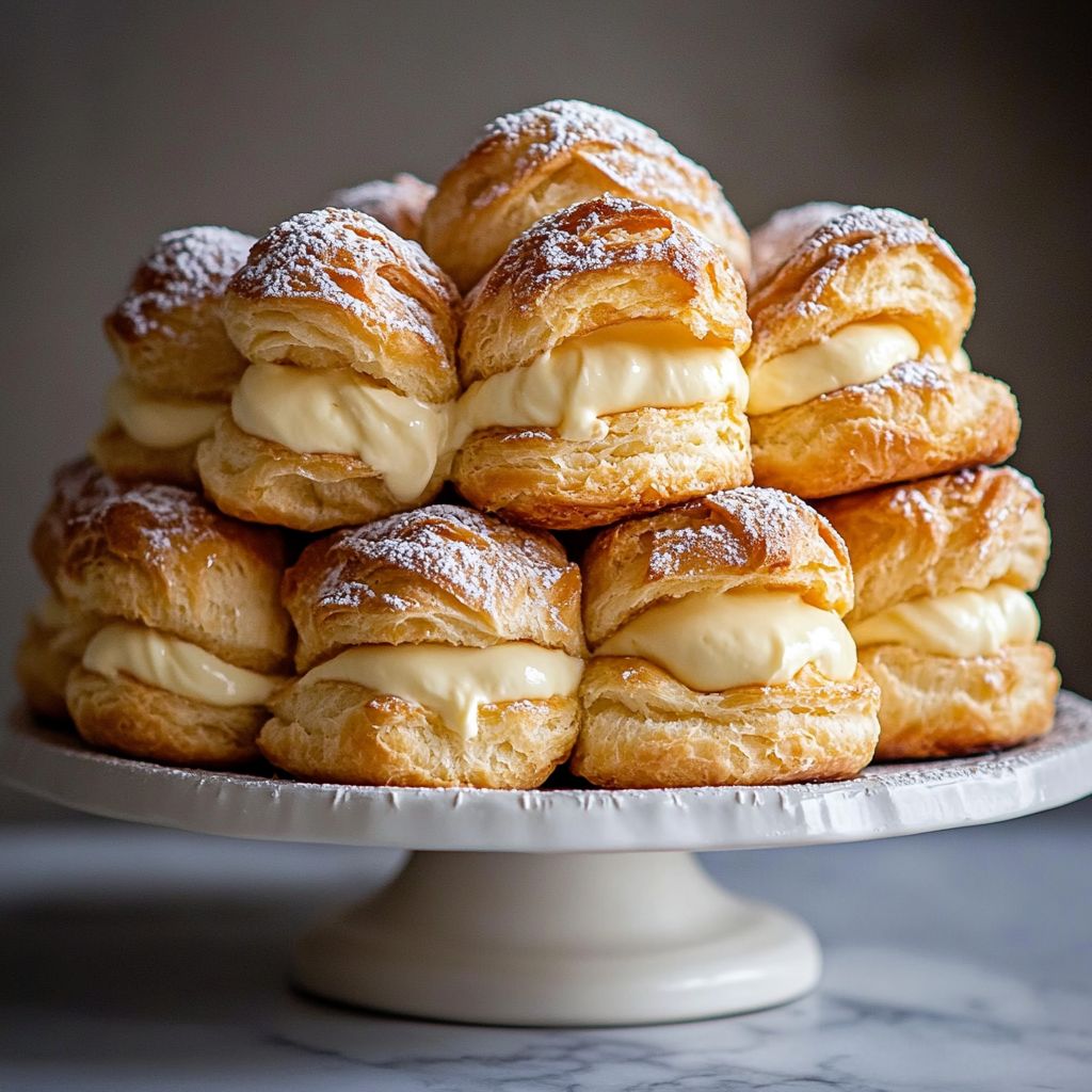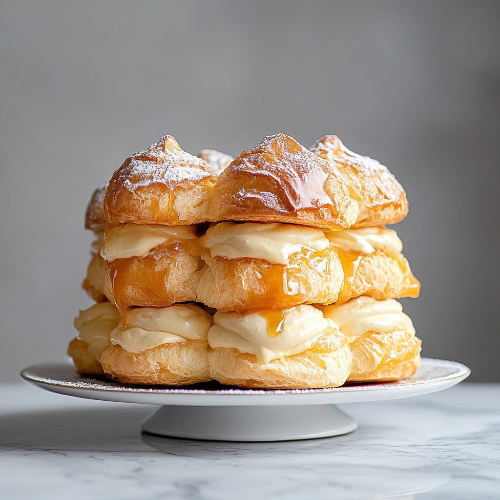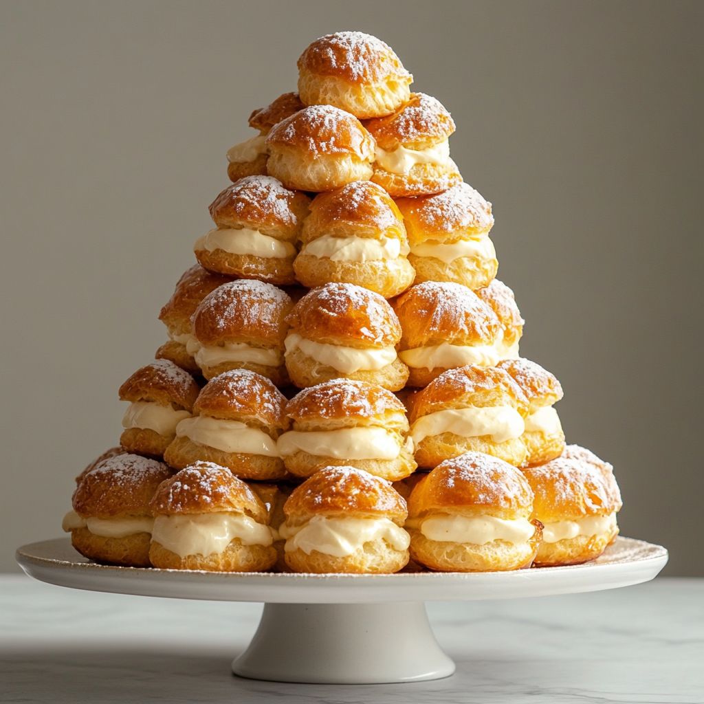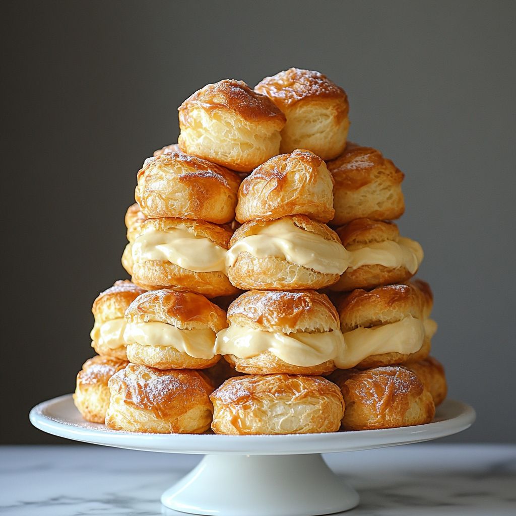 A cake made by stacking light, hollow choux pastries (cream puffs) with silky vanilla pastry cream between the layers. It’s typically finished with a glaze or dusting and can be served chilled or at room temperature. Makes about 8–12 servings depending on size.