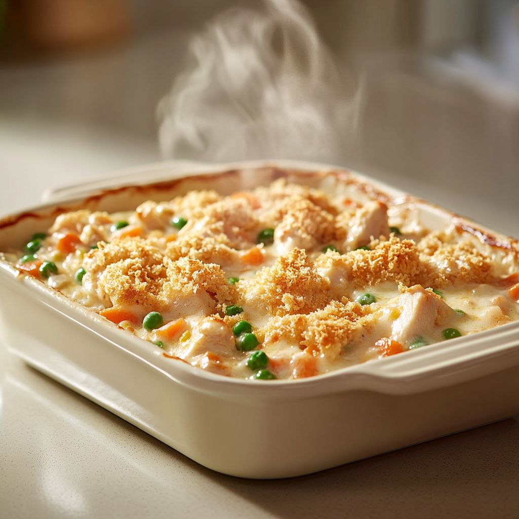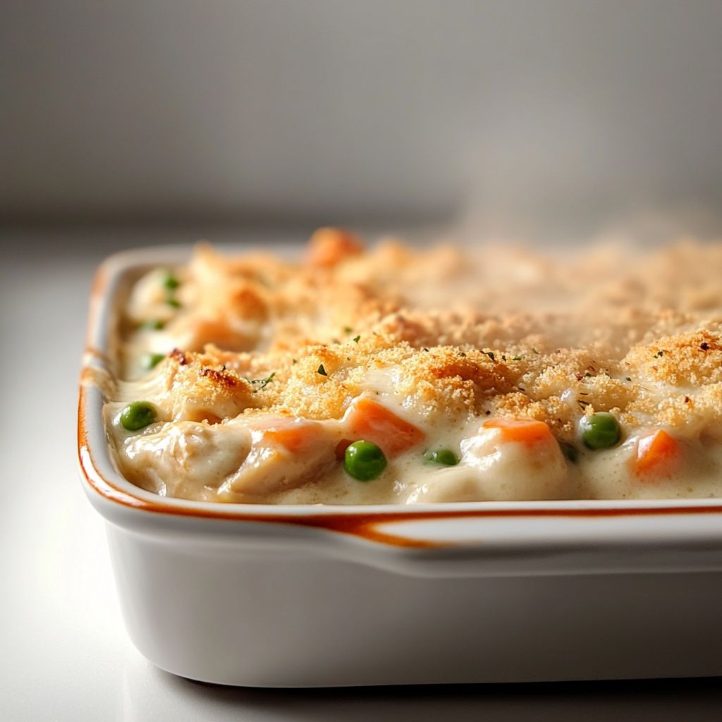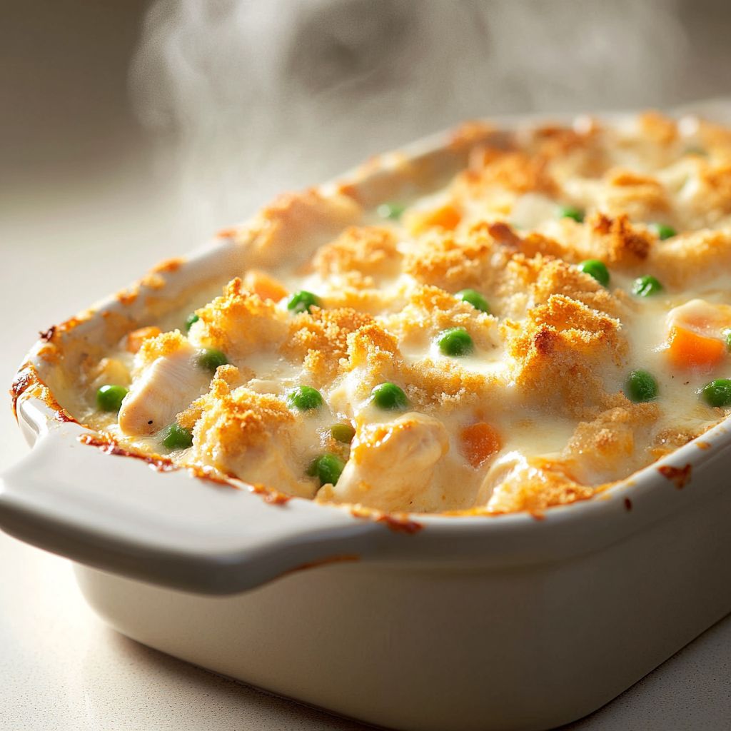 A comforting baked dish featuring tender chicken in a rich, creamy sauce, often with cheese and vegetables, and topped with crunchy crumbs. It’s typically served over pasta, rice, or potatoes and baked until bubbly and golden.