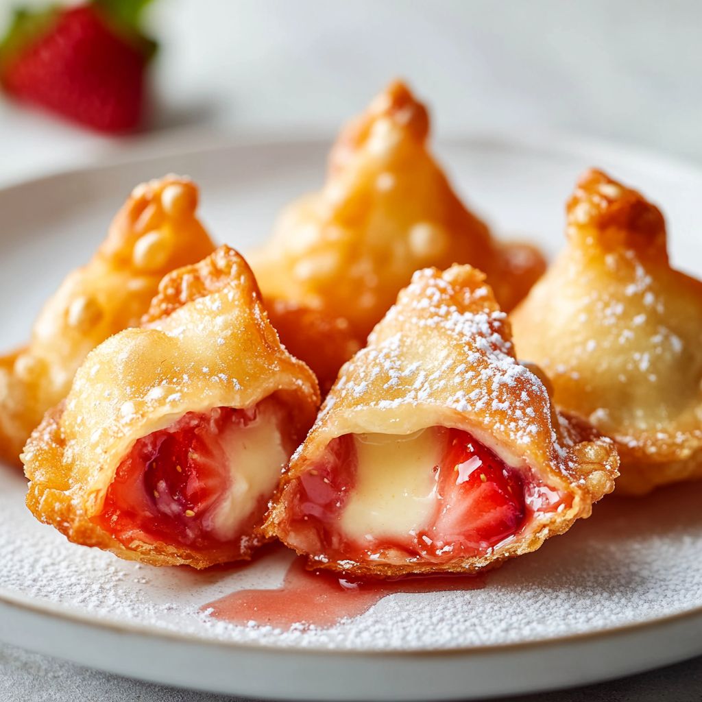 They are bite-sized desserts made by stuffing square wonton wrappers with a creamy strawberry cheesecake filling, sealing the edges, and frying until goldeny crispy. They’re perfect for entertaining or a fun treat.