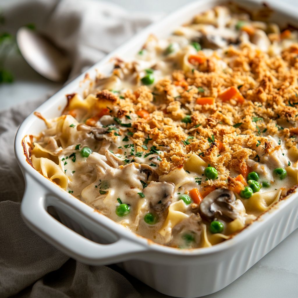 Vegetables contribute color, brightness, and texture—kept tender and not mushy, so they provide gentle bite rather than a competing softness. The sauce often develops a delicate depth through slow reduction and the natural sweetness of aromatics softened in fat and heat. A lightly crisp top offers a satisfying textural contrast: a thin, amber-gold crust that gives way to a creamy interior. There is a whisper of savory herbal notes, perhaps a hint of garlic, onion, or pepper, but not so strong as to overpower the dish’s essence. The overall flavor is that classic homey balance—comforting, familiar, and inviting, with enough richness to feel indulgent without being excessive. The taste lingers warmly, making you want a second helping and a third conversation around the table.