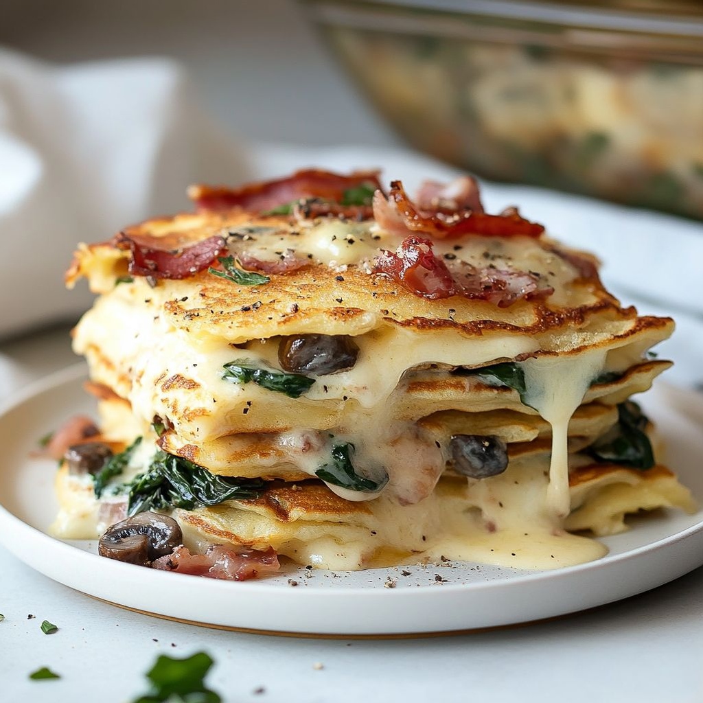These Casseruola pancakes are a hearty, savory casserole-style bake that layers grated potatoes, sautéed vegetables, and melted cheese into a sliceable, comforting dish. You can customize them by swapping in your favorite fillings—try extra mushrooms, spinach, peppers, or different cheeses, and add cooked sausage or bacon for smoky richness. They freeze well: cool completely, then freeze slices in a single layer before bagging for quick reheats; rewarm in a 350°F (175°C) oven until hot and bubbling. For serving, finish with a dollop of sour cream or yogurt and a sprinkle of chopped parsley or chives. If you need to keep it gluten-free, use a 1:1 gluten-free flour blend and check any processed fillings for gluten; dairy-free options work by using dairy-free cheese and milk alternatives.