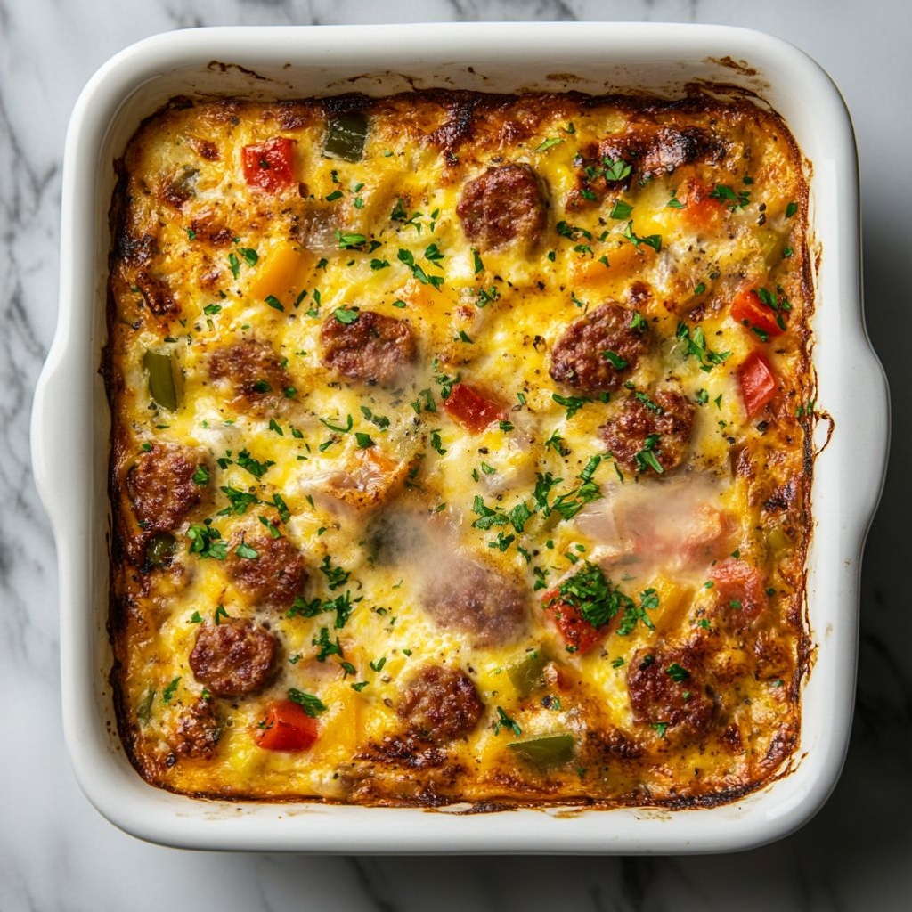 These sausage and egg casserole notes guide you through a hearty Italian-inspired bake of crumbled sausage, eggs, dairy, and cheese. Brown the sausage well and drain excess fat to keep the casserole from greasiness, and sauté onion, garlic, and red pepper until softened for the flavor foundation. Whisk eggs with milk or cream until smooth, then fold in crushed tomatoes and cheese to create a rich custard with a light sauce base. For best texture, use room-temperature eggs and, if desired, a mix of milk and cream for extra richness. Season gradually with Italian seasoning or oregano, salt (sausage will season the mix), and black pepper; add red pepper flakes for a gentle heat if you like. Optional add-ins like mushrooms, spinach, or ricotta can boost creaminess and color; distribute them evenly so every slice gets flavor. The optional bread cubes add structure and soak up custard, but omit or substitute with gluten-free bread if needed. Top with Parmesan and mozzarella to create a gratin-like finish and bake until just set and lightly golden; rest before slicing for clean cuts. This dish stores well in the fridge for several days and freezes well in portions for quick meals; reheat gently to maintain moisture. Serve with a simple green salad or a side of crusty bread (or gluten-free bread) and a sprinkle of fresh parsley.
