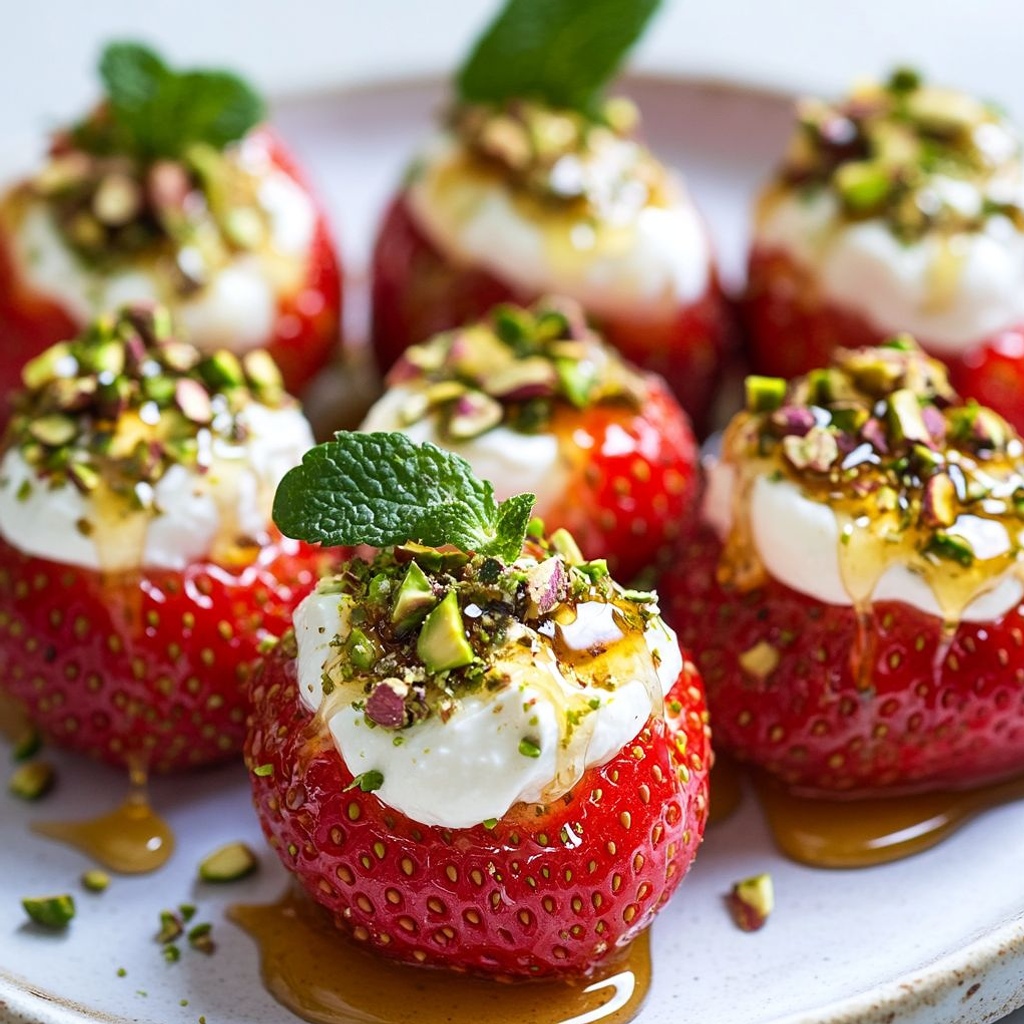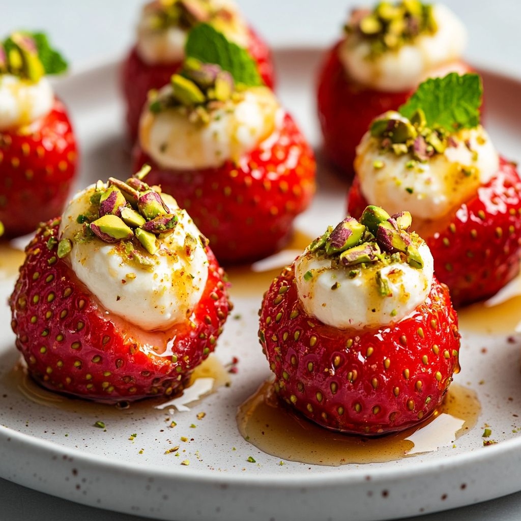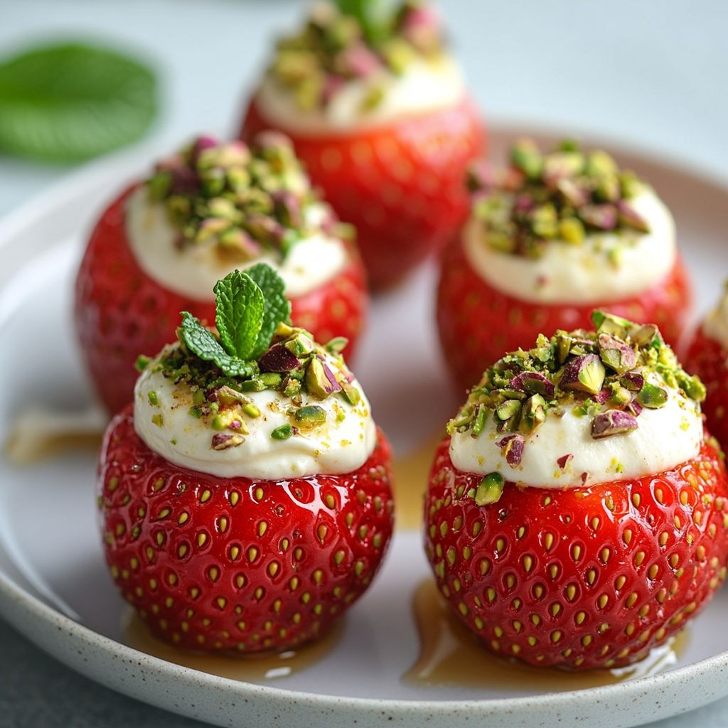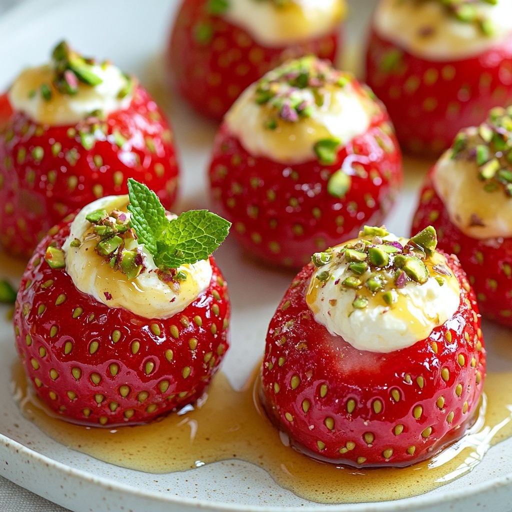 → Toasting intensifies the nutty aroma and helps the pieces stay crunchy when sprinkled on the finished berries. - Just before serving, drizzle the cooled chocolate over the filled strawberries in thin lines, then sprinkle with the toasted pistachios or almond slivers and garnish with fresh mint leaves if using; finish with a light dusting of cocoa powder or powdered sugar for a refined look.
