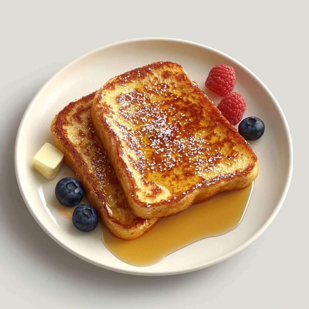 A classic breakfast dish where thick slices of bread are dipped in a rich egg-milk custard flavored with vanilla and cinnamon, then fried until golden and slightly crispy on the outside.
