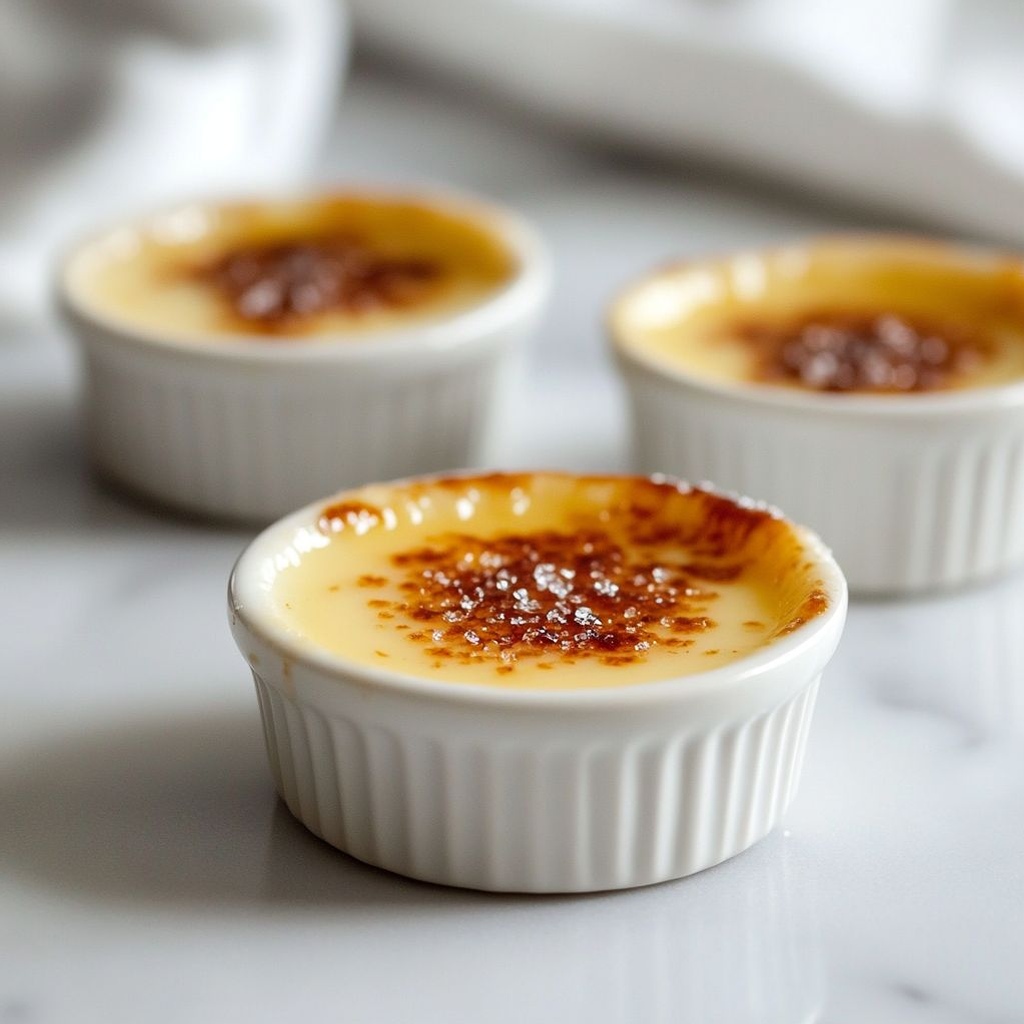 Mini crème brûlée is a small, single-serving custard dessert made with cream, egg yolks, vanilla, and sugar, topped with a crisp caramelized sugar shell just before serving. Each ramekin yields a creamy center with a crackly top.