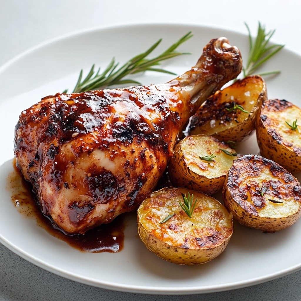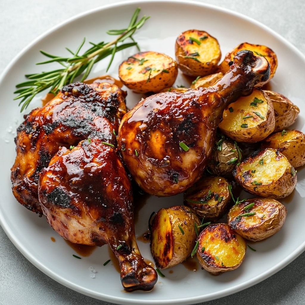 → Glasear en los últimos minutos intensifica el sabor, añade brillo y crea una capa caramelizada que mejora la textura. - Verifica la cocción interna del pollo usando un termómetro; la temperatura debe alcanzar al menos 74°C (165°F) en la parte más gruesa del muslo y las patatas deben estar tiernas al pincharlas.