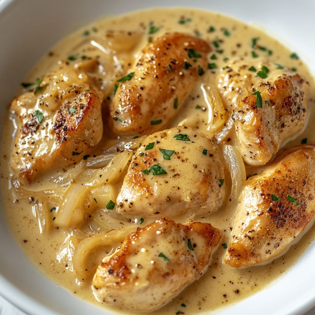 → Why: parsley provides color and a fresh contrast to the richness; seasoning adjustments ensure the final dish is balanced and vibrant, with heat adjusted to preference. - Plate the creamy onion chicken and spoon extra sauce over each piece; serve with cooked pasta, steamed rice, or crusty bread to soak up the sauce.