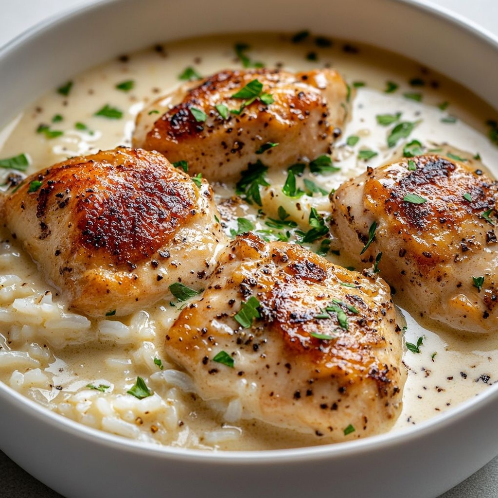 These Pollo cremoso con arroz notes describe a comforting, one-pan-style dish with juicy seared chicken, fluffy rice cooked in hot broth, and a silky cream sauce enriched with Parmesan. For best results, pat the chicken dry and season lightly before searing to develop color, then rest while you finish the sauce; rinse the rice until the water runs clear to remove surface starch and cook it in hot broth to infuse flavor and keep the grains separate. In the crema, combine heavy cream, whole milk, and Parmesan, and thicken with a little all‑purpose flour or cornstarch—if using flour whisk it with a splash of hot sauce to form a slurry, or use a cold-water cornstarch slurry to prevent lumps; optional cream cheese adds extra silkiness, and a kiss of smoked paprika provides warmth and color. Finish with a bright lemon juice on the end to counterbalance richness. Sauté aromatics—onion first, then garlic—to build depth, and if you like earthiness, add mushrooms and thawed peas toward the end to preserve texture and color. Season thoughtfully with kosher salt and black pepper, and if you want a subtle herbal note, a pinch of dried thyme or oregano works best sparingly so it doesn’t overwhelm the creamy sauce. Finish with butter for gloss, scatter fresh parsley and extra Parmesan just before serving, and offer lemon wedges on the side for a fresh finish. For gluten-free preparation, use cornstarch or gluten-free all-purpose flour as the thickener and ensure the broth is gluten-free; leftovers refrigerate well for a few days and reheat gently with a splash of broth or milk to loosen the sauce.