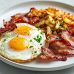 This Poutine Colazione delivers a crispy potato base, hot savory gravy, and melty cheese with a rich yolk on top—an indulgent breakfast twist on a classic. For the base, grate the potatoes into thin matchsticks or coarse shreds and thoroughly dry them to remove moisture; this helps achieve a crisp surface. Fry in hot neutral oil in small batches until deeply golden, seasoning with 1/2 teaspoon salt and 1/4 teaspoon black pepper; for extra crunch, refrigerate the shredded potatoes for 15-20 minutes and squeeze out any remaining moisture before frying, and consider a light dusting of smoked paprika if you enjoy a hint of smokiness. Keep the gravy hot and smooth; whisk out lumps if using store-bought gravy and reheat gently before serving, or make a quick mushroom gravy for a vegetarian option. If using cheese curds, scatter them over the hot base so they begin to soften but still hold their squeak; or use 1 1/2 cups shredded mozzarella or mild cheddar for a fully melted layer with different texture. Top with four freshly fried or poached eggs so the yolks mingle with gravy and cheese; finish with finely chopped green onions for brightness and color. Optional: add crispy bacon bits or pancetta for extra crunch, and offer hot sauce or pickled jalapeños to taste. Serve immediately to enjoy maximum crispness and a decadent runny yolk; leftovers tend to soften the potatoes, but you can reheat in a hot oven to regain some texture. For gluten-free considerations, ensure the gravy and Worcestershire sauce are gluten-free, or make your own gluten-free gravy to guarantee a safe, delicious result.
