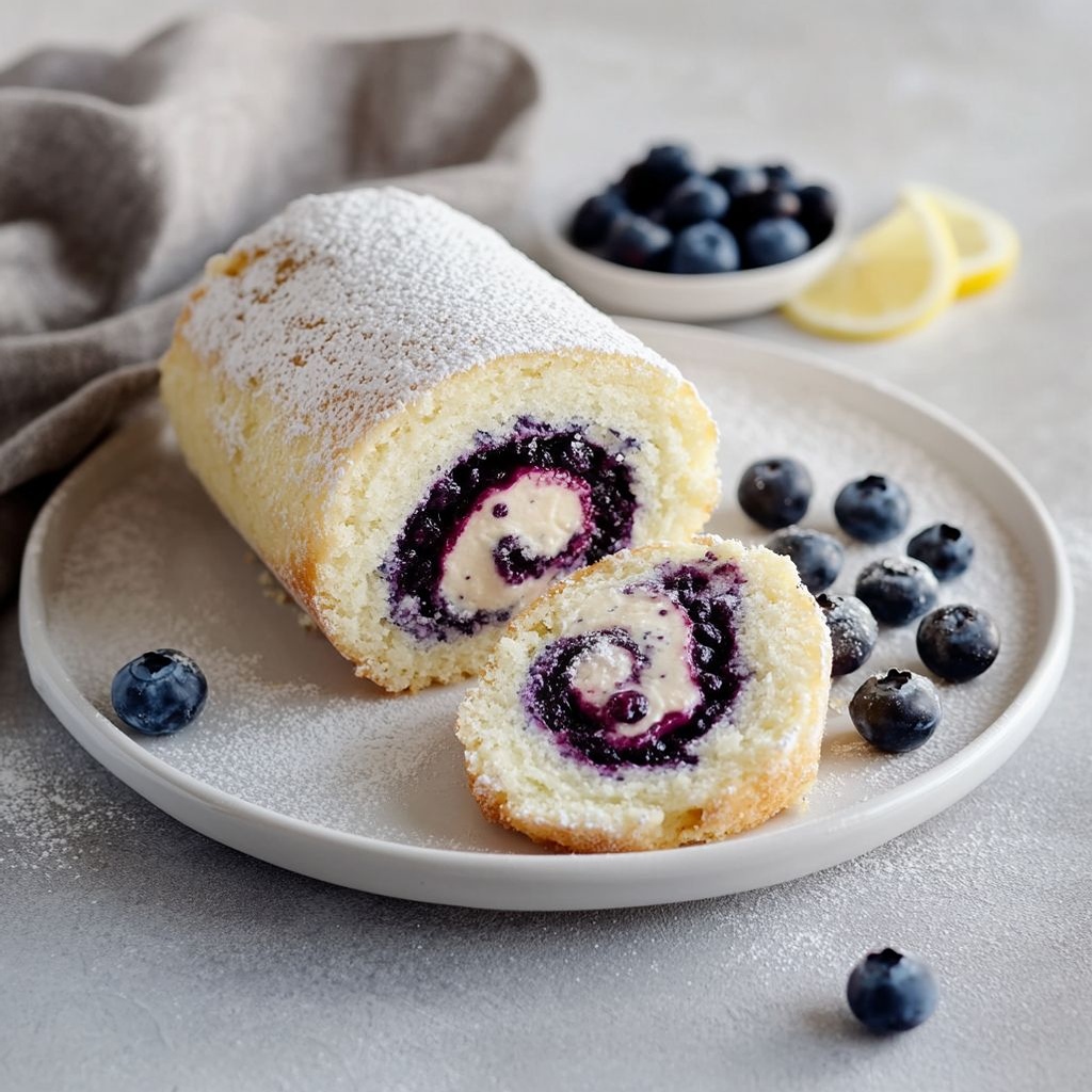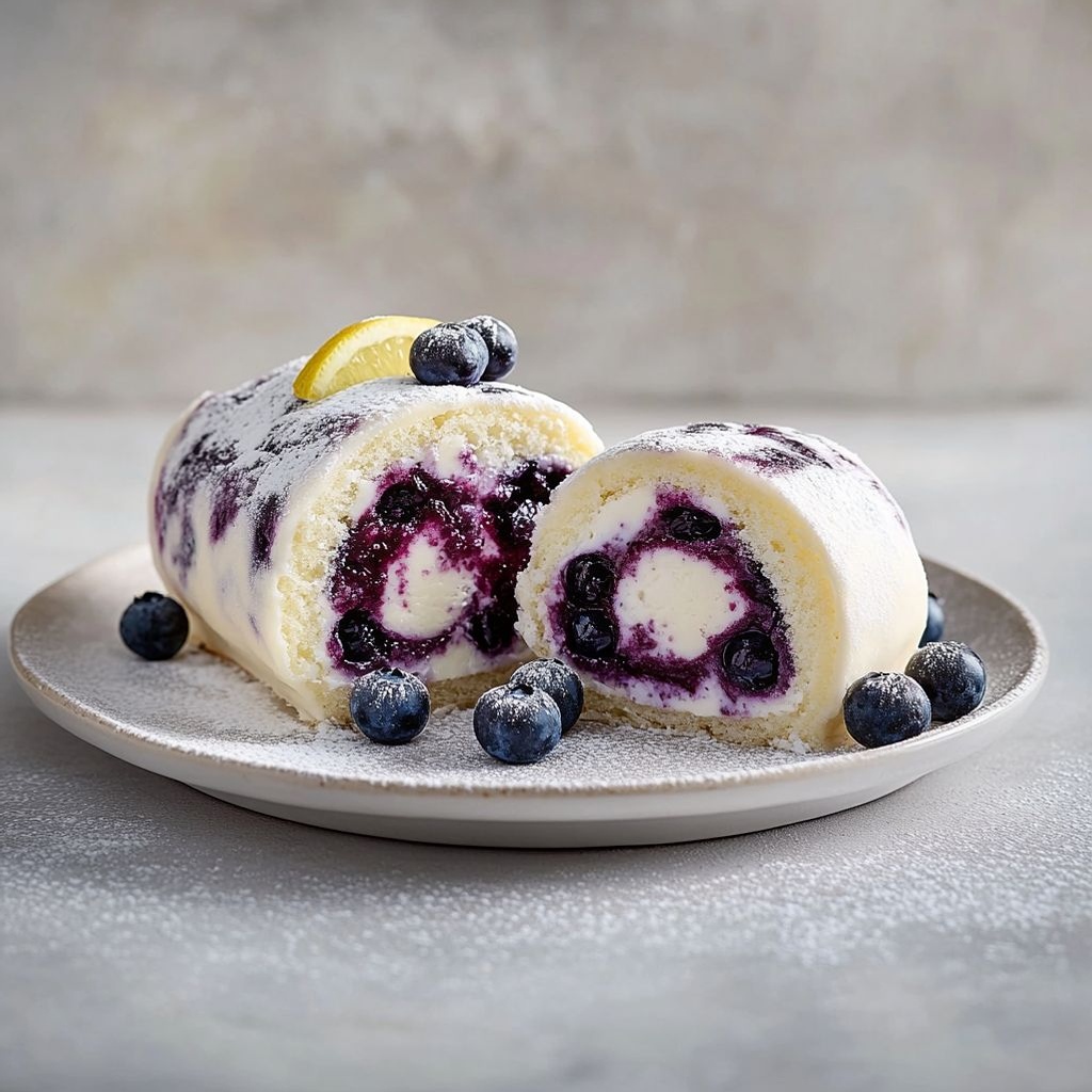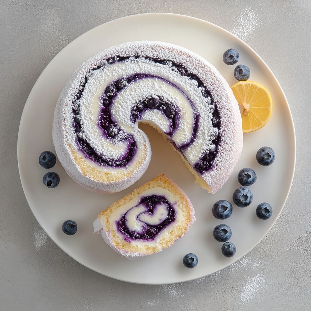 → A long chill firmed the filling and helped the roll hold shape for clean slicing; the exterior will look glossy and the interior will be sliceable. - Just before serving, dust the roulade with powdered sugar and garnish with extra fresh blueberries for a bright, elegant finish.