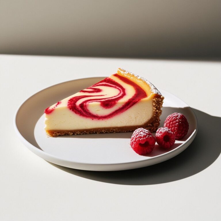 → The final release and presentation showcase a clean edge and vibrant swirl, while the fresh berries add color and a contrasting tart bite just before serving. - Slice with a warm, sharp knife wiped clean between cuts; serve chilled for a creamy, indulgent dessert with a bright raspberry contrast.