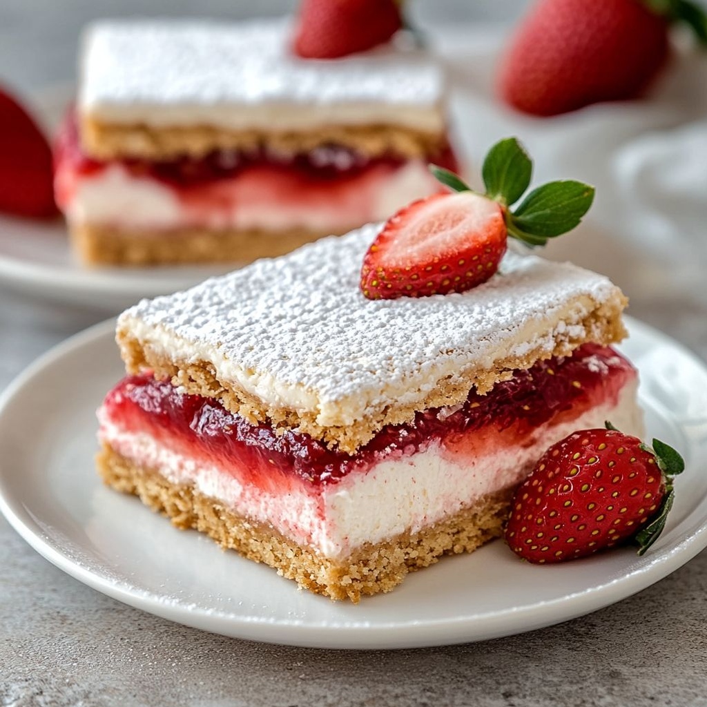 A no-bake dessert that sandwiches a creamy strawberry cheesecake filling between two cookies or biscuit bases. It’s cool, fruity, and quick to assemble—perfect for a cheerful treat or party dessert.