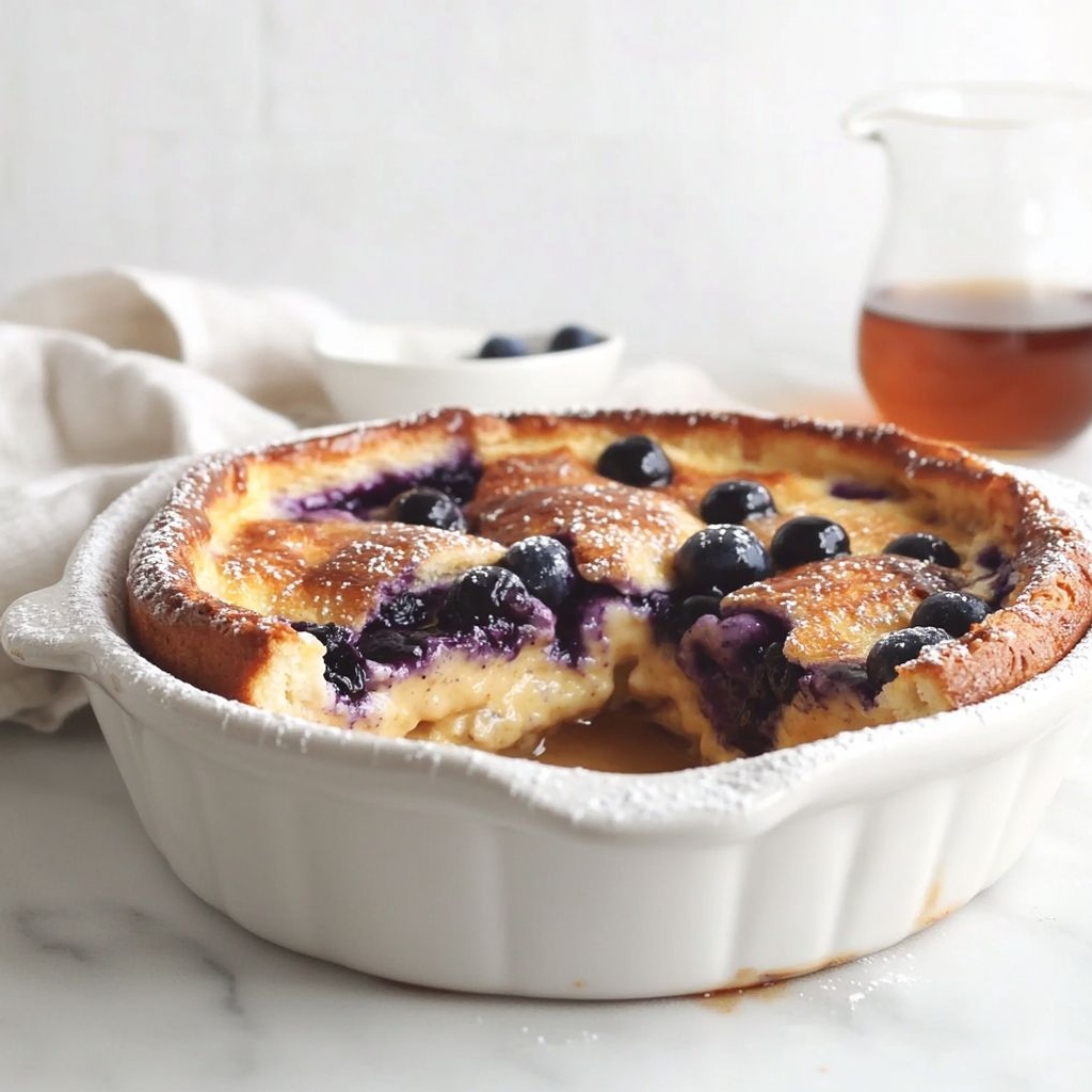 A comforting baked breakfast or brunch dish. It combines bread cubes with a custard of eggs, milk, vanilla and cinnamon, folded with blueberries, then baked until set and golden. It’s perfect served warm with maple syrup and extra berries.