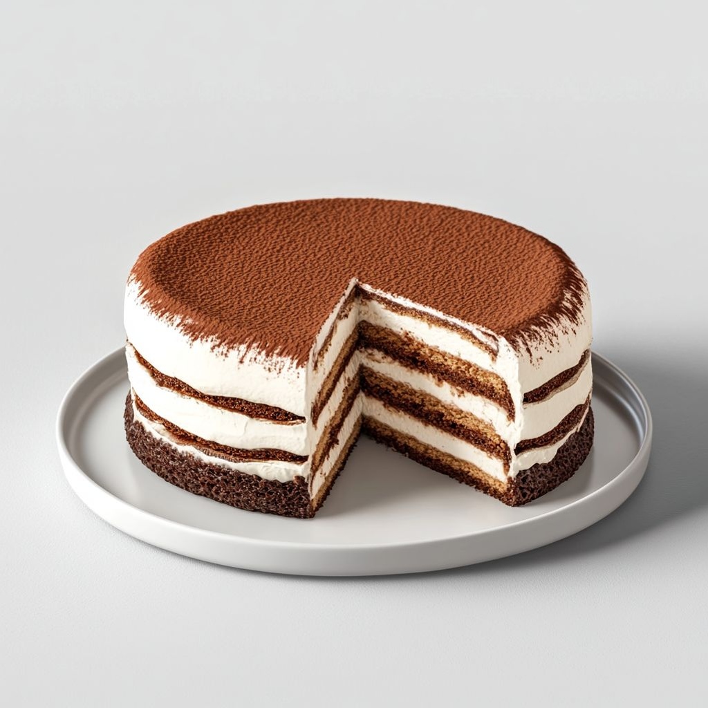 → The soak hydrates the cake and infuses coffee flavor; a generous but even layer of cream creates the classic tiramisu texture between layers. - Place the second cake layer on top, press gently to seat, then brush the top surface with more coffee soak and spread the remaining mascarpone cream over the top and sides with an offset spatula for a smooth finish.