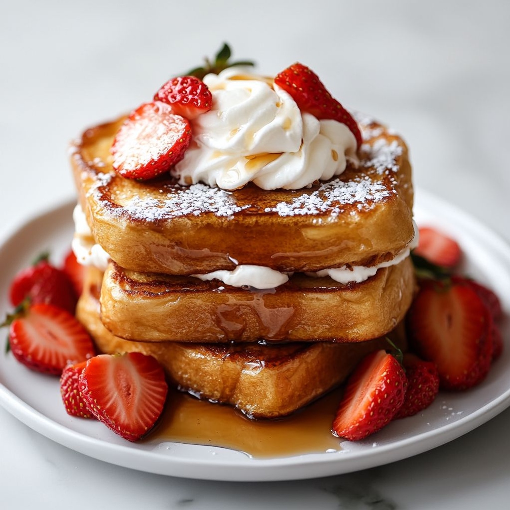 Stack the warm French toast slices on plates, top with sliced fresh strawberries, add a dollop of whipped cream or mascarpone, and finish with a drizzle of maple syrup or honey. A light dusting of cinnamon can add extra aroma.