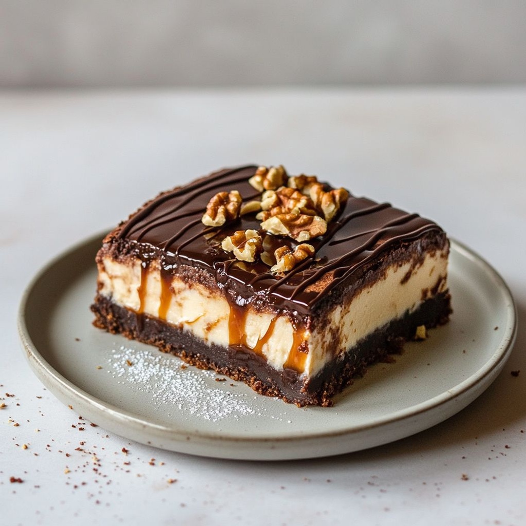 A decadent dessert that combines rich fudgy brownies with a creamy cheesecake swirl, finished with indulgent toppings like chocolate chips, caramel, and optional nuts. It’s a two-layer treat with a chewy brownie base and a smooth cheesecake center.