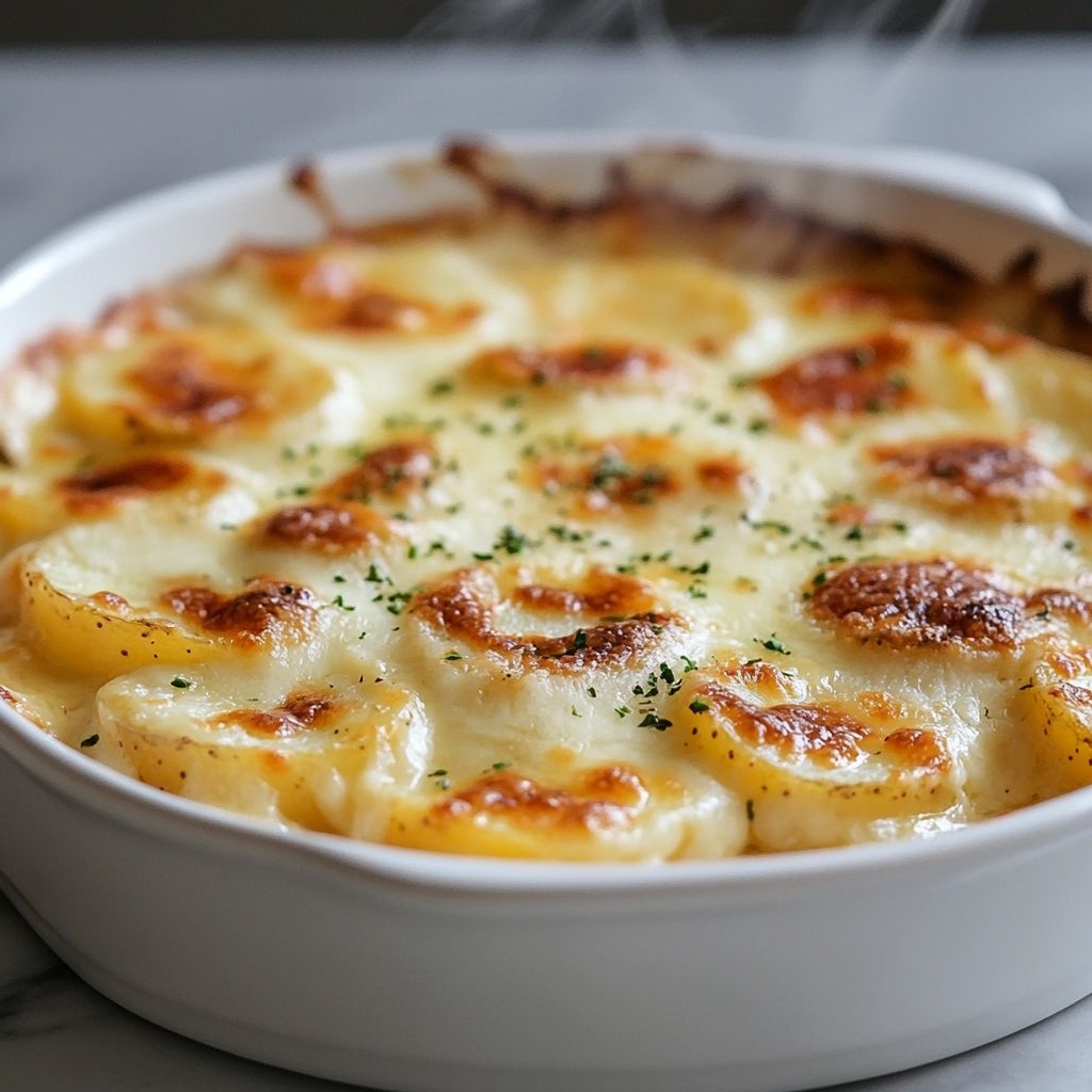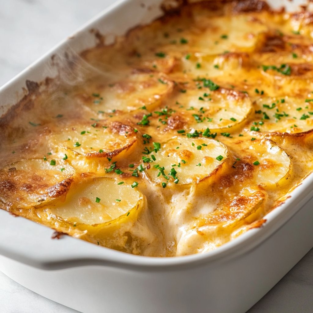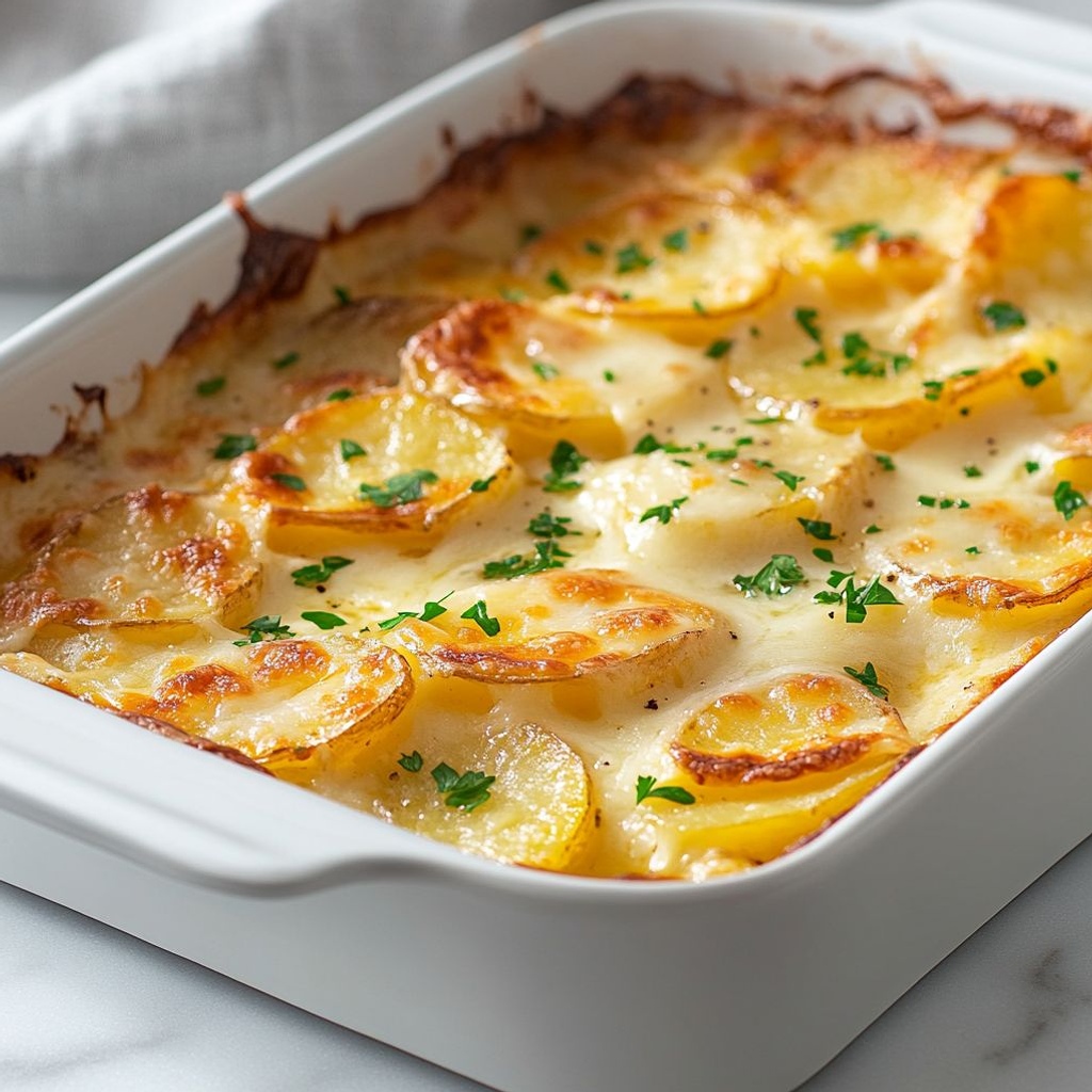 A comforting dish made by layering thin-sliced potatoes with a creamy cheese sauce, then baking until tender and golden on top. It serves about 6–8 people and pairs well with a simple salad or steamed vegetables.
