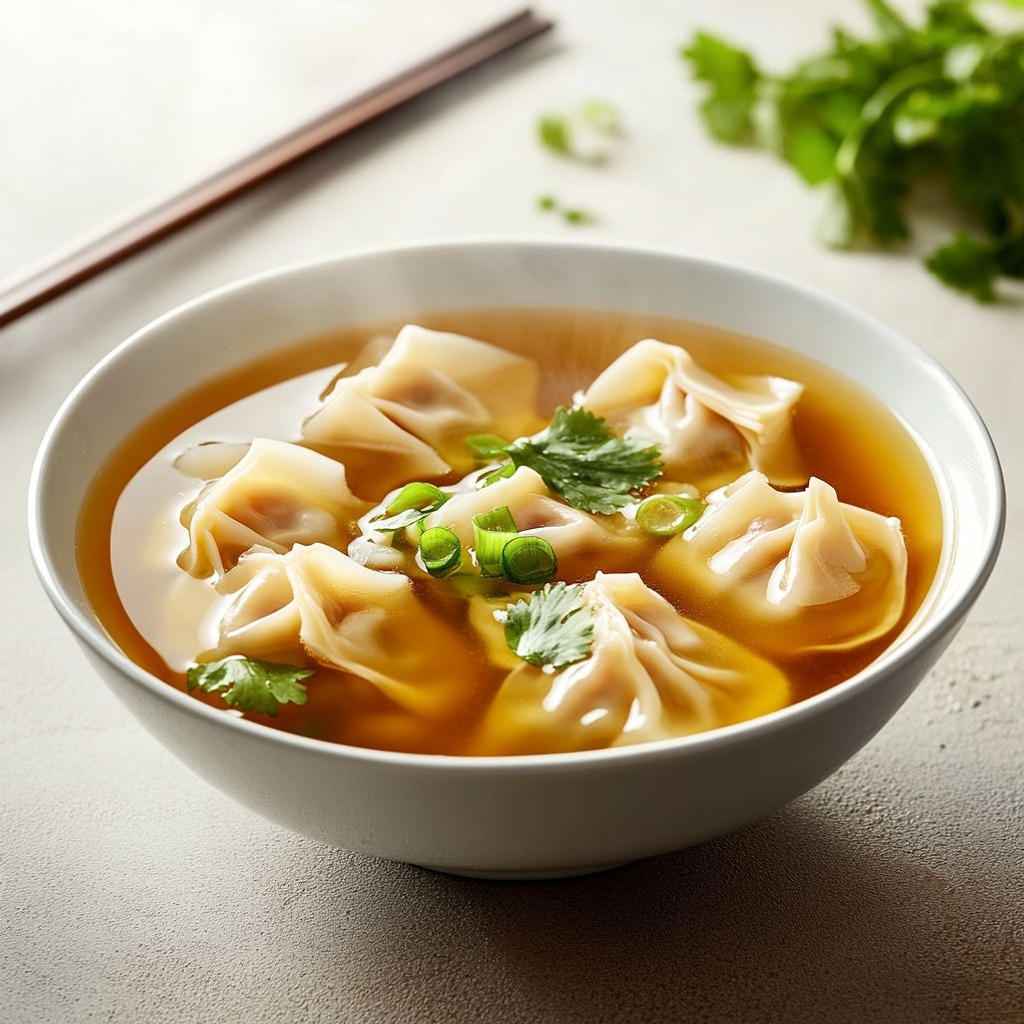 The broth is best simmered gently; use low-sodium chicken stock and infuse with fresh ginger and garlic, then skim any foam for a clear, clean-tasting soup. Taste and adjust salt and white pepper after the wontons are added, since the filling and broth both contribute salt. For a richer aroma, you can add a splash of Shaoxing wine or dry sherry and finish with a drop of sesame oil just before serving.