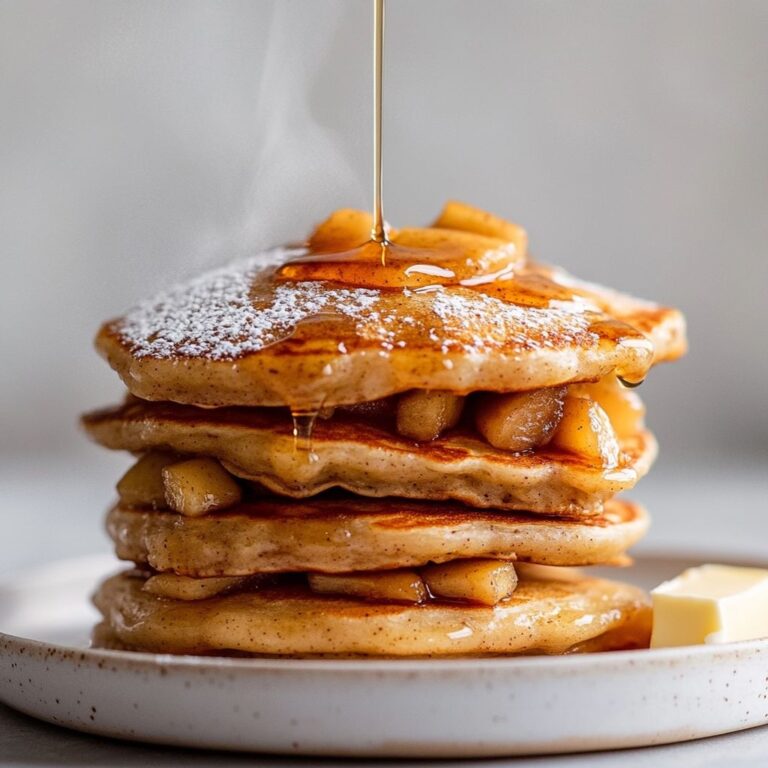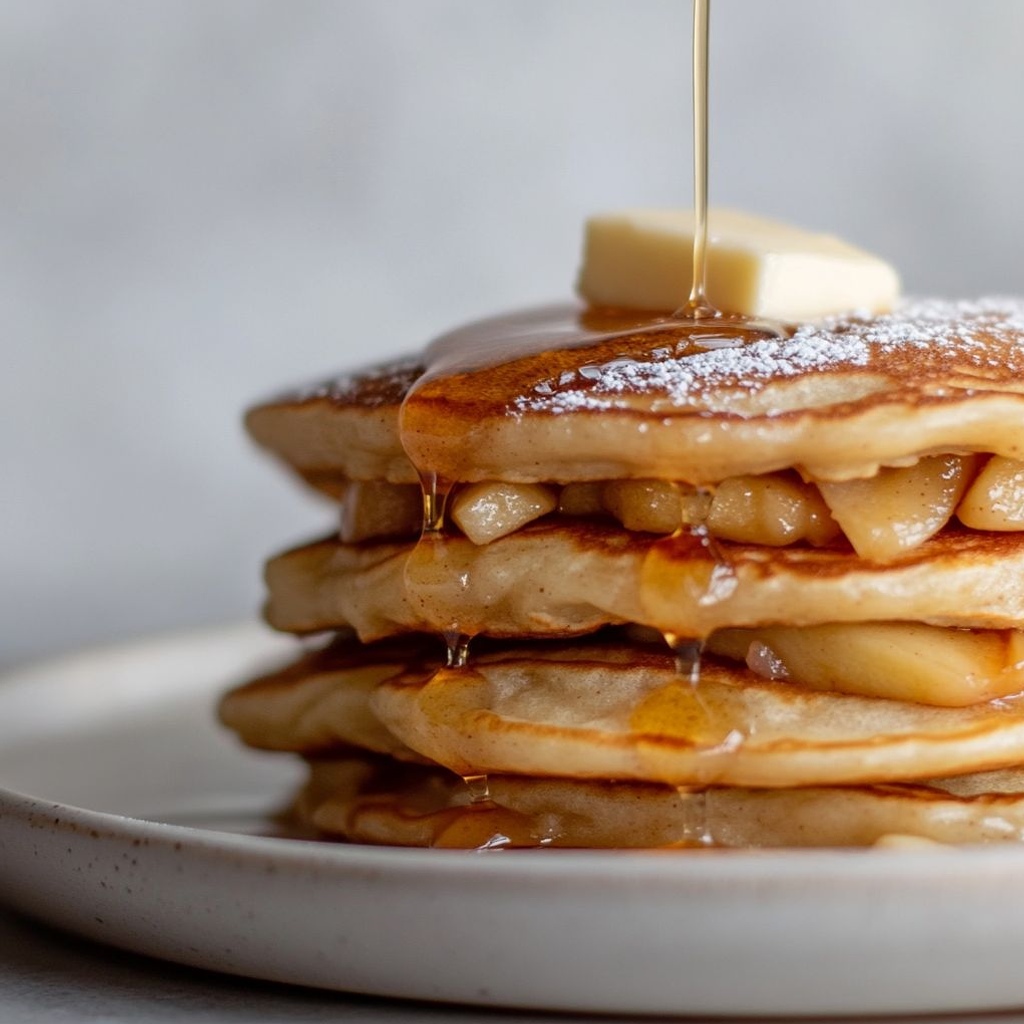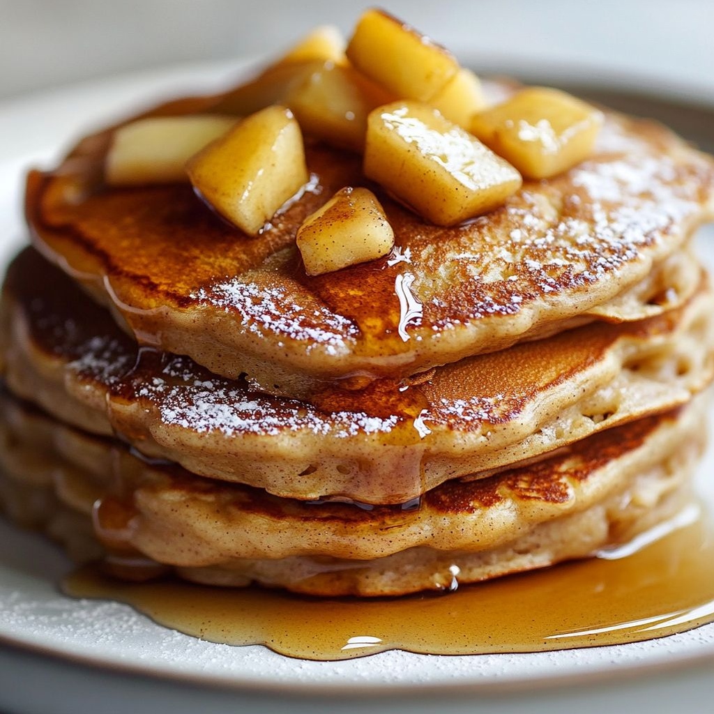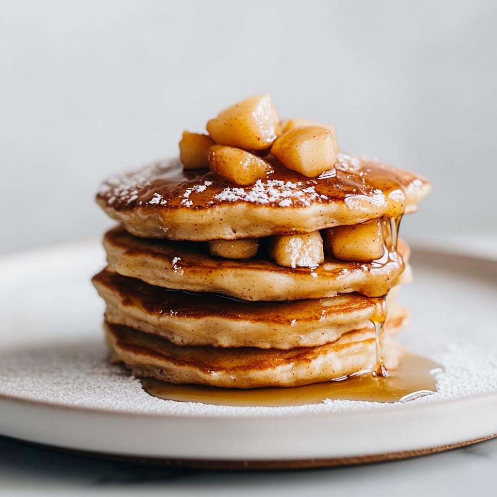 → Stacking and warming helps maintain moisture and texture across all pancakes, so the entire serving remains tender and evenly cooked. - To finish and serve, warm 1/2 cup pure maple syrup if desired and arrange toppings: dust with powdered sugar, add extra apple slices or a small spoon of apple compote, and serve with warm maple syrup. The warmth helps syrup flow smoothly over the pancakes and enhances the aroma of vanilla and cinnamon.