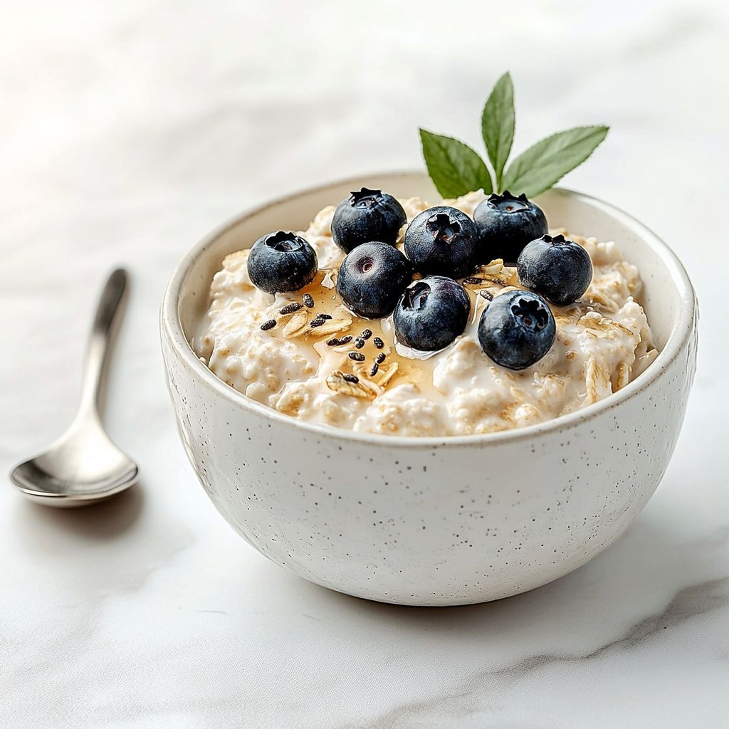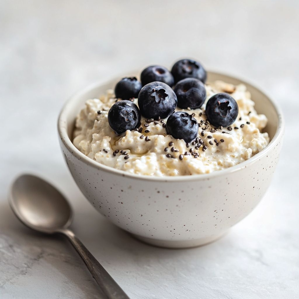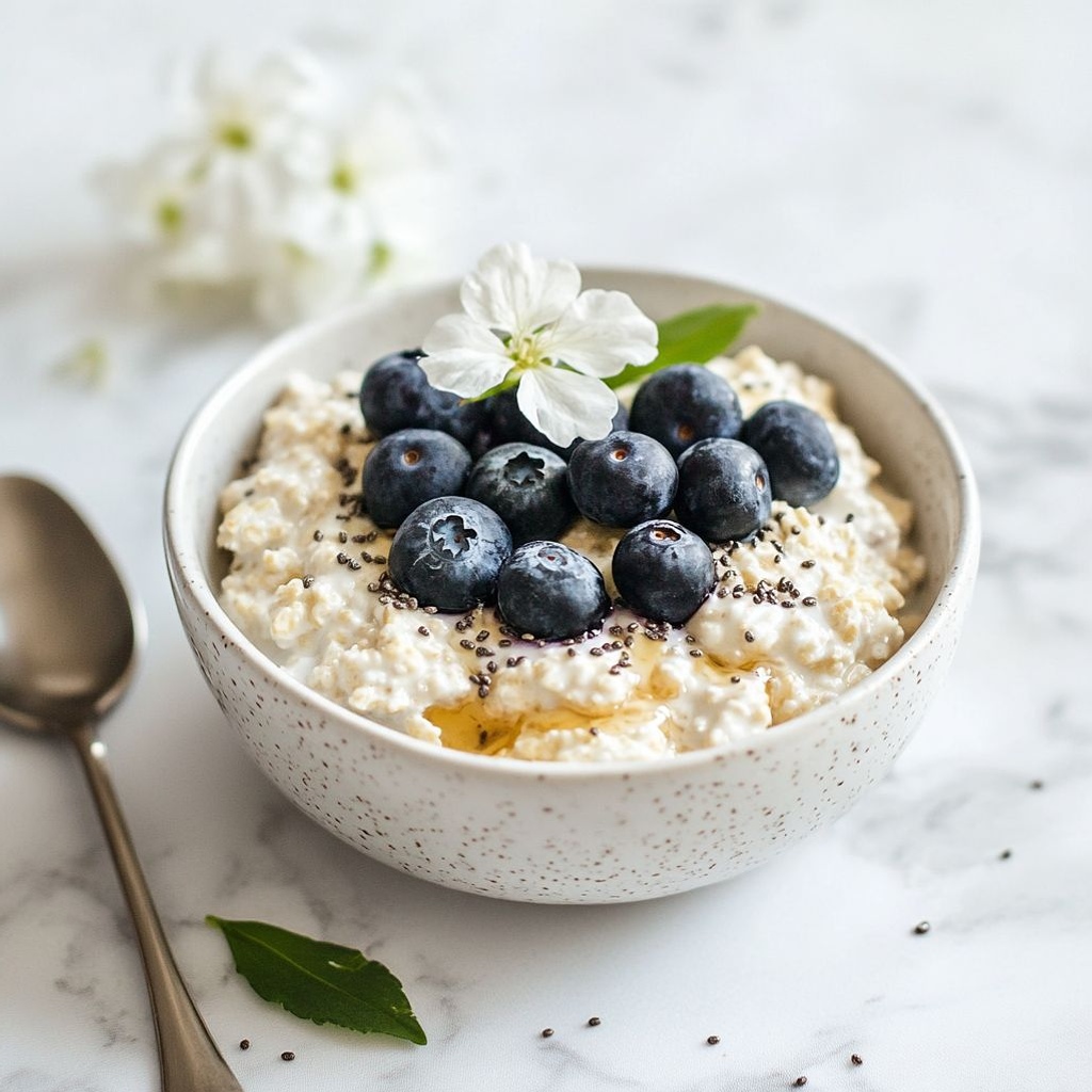 A quick, creamy breakfast bowl that blends oats with cottage cheese and a protein boost, folded in blueberries for natural sweetness and antioxidants.