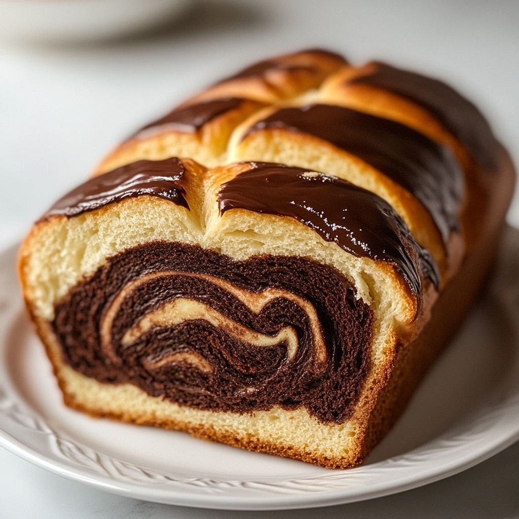 A rich, tender brioche loaf with a chocolate swirl running through the dough. It’s an enriched bread with eggs and butter that creates a moist crumb and a glossy crust, with ribbons of chocolate throughout for a delightful marbled effect.