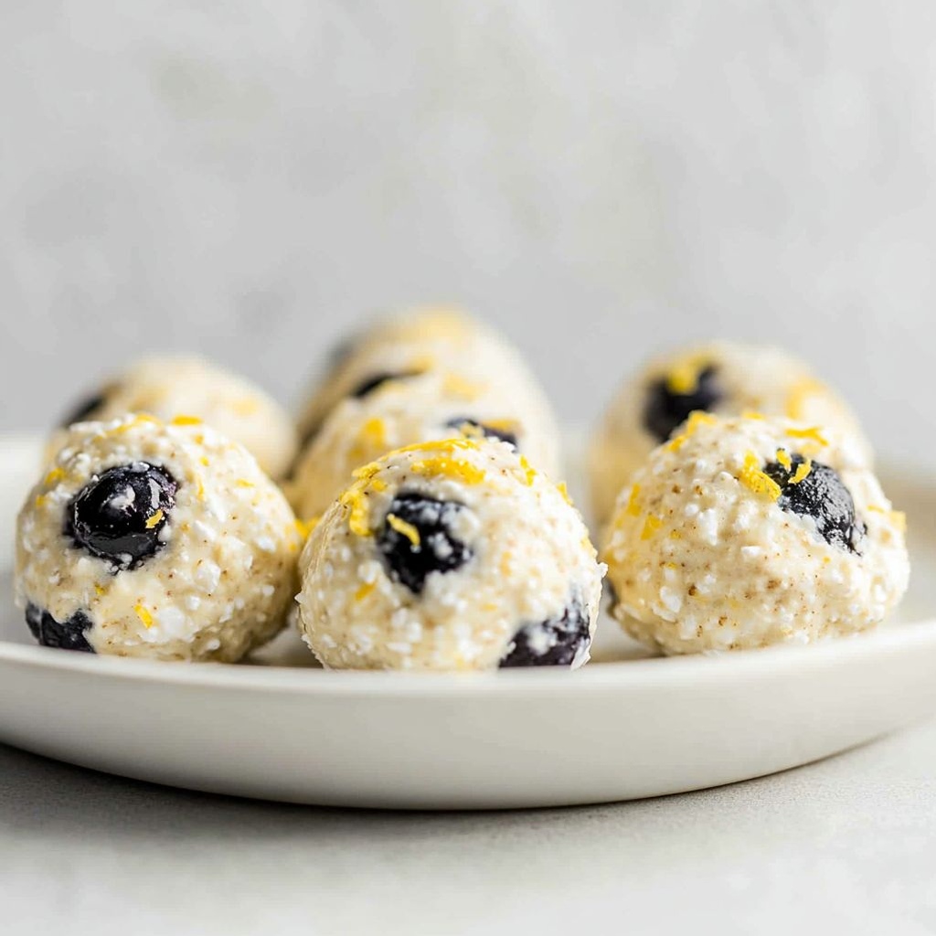 They are no-bake, protein-packed snacks made with cottage cheese, lemon zest and juice, blueberries, oats, and protein powder. The mixture is chilled and rolled into bite-sized balls for a convenient, refreshing treat.