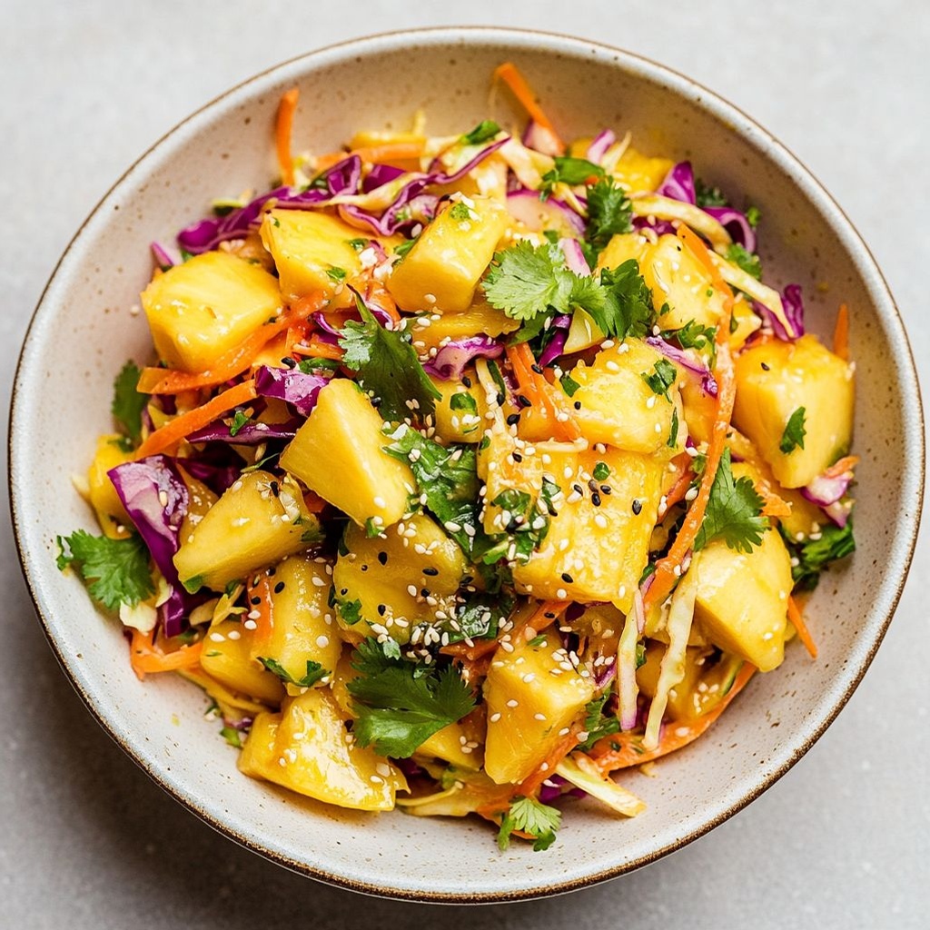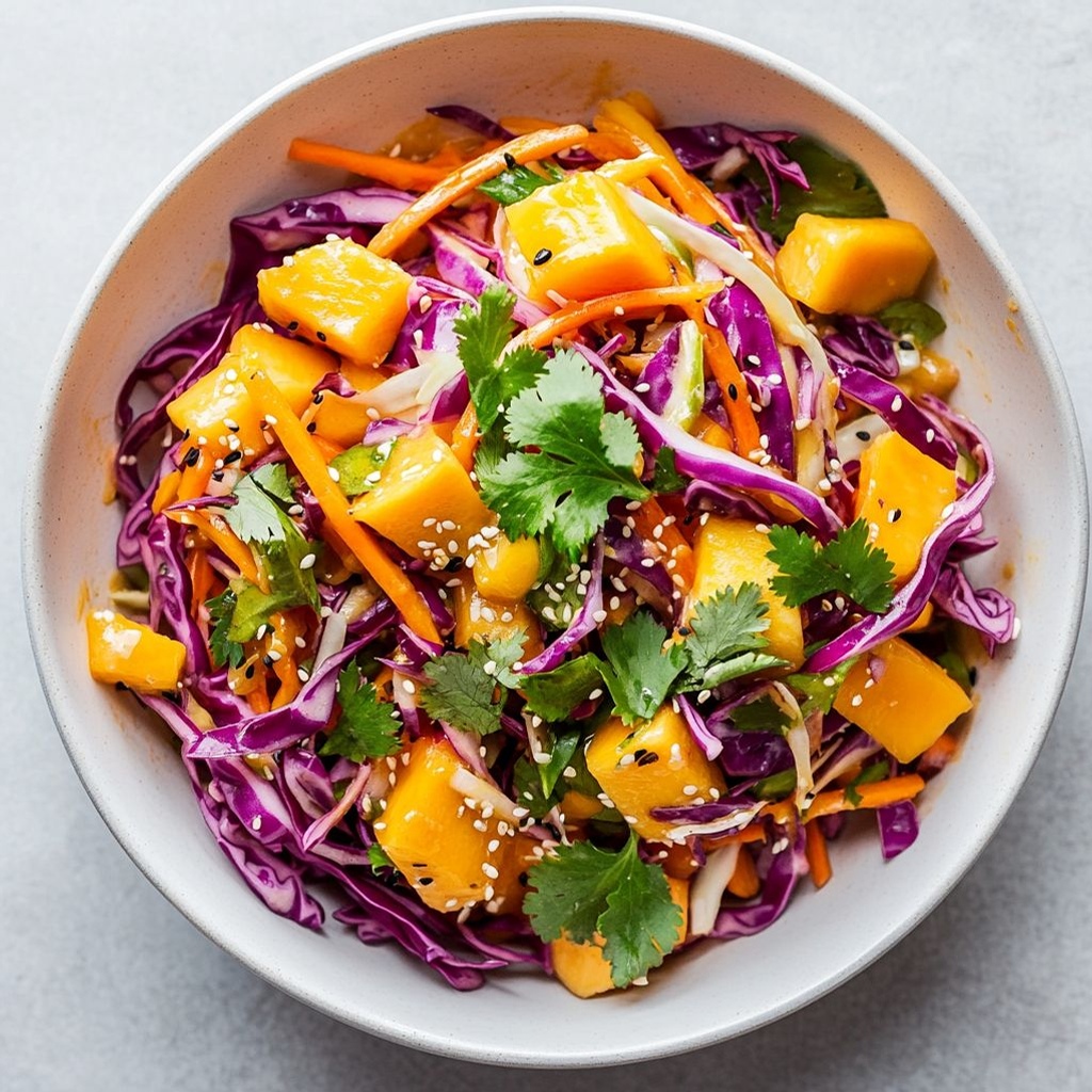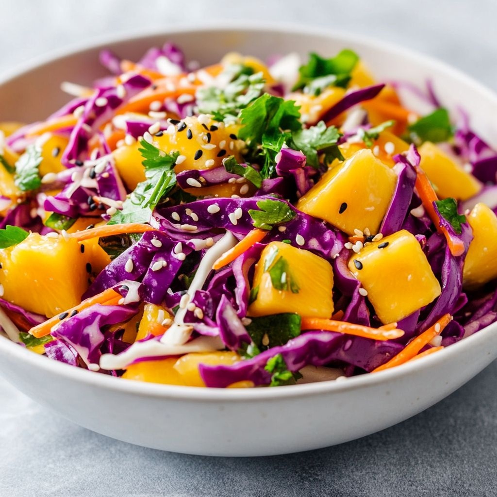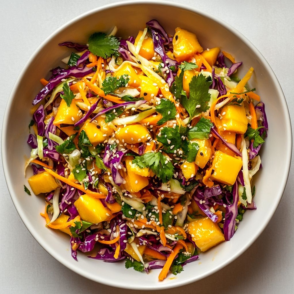 A bright, crunchy slaw made with shredded cabbage, juicy mango, and a tangy lime dressing. It’s a tropical, refreshing side or topping that pairs well with grilled proteins and tacos.