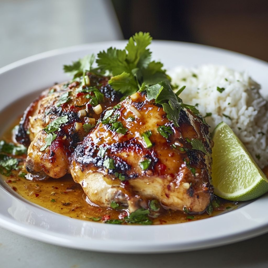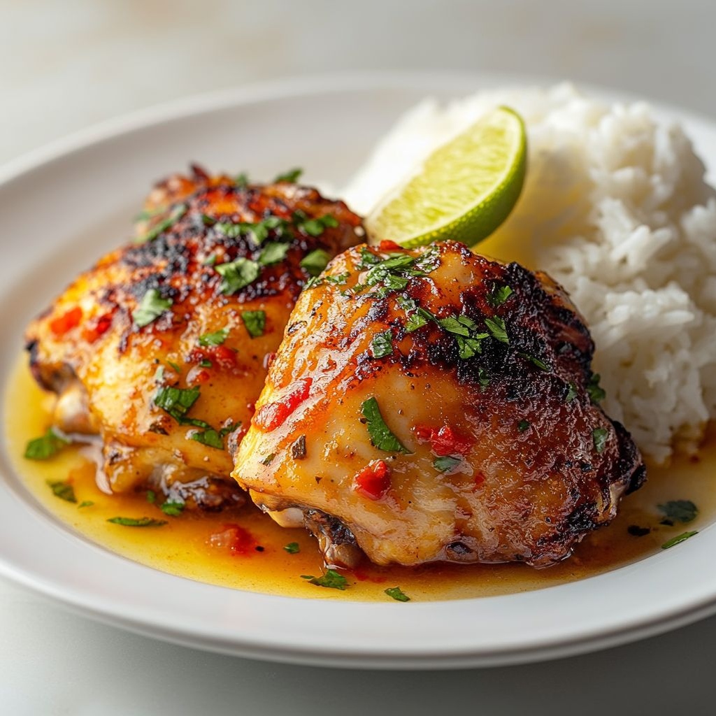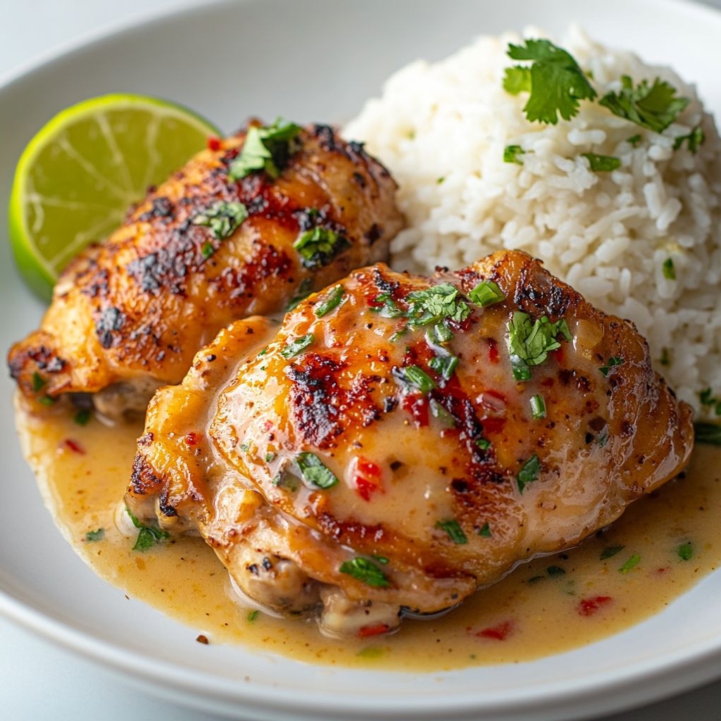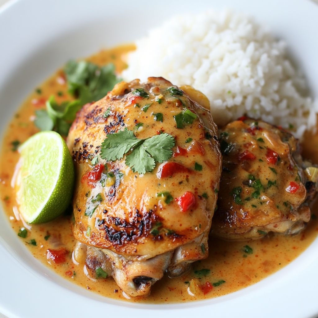 → Balancing salt, acidity, and heat at the end refines the dish; finishing oils and fresh herbs heighten aroma and freshness just before serving. - Serve with steamed white rice and garnish: mound fluffy steamed rice on plates, spoon the spicy coconut chicken and sauce over the top, place lime wedges on the side, and sprinkle the reserved 2 tablespoons toasted coconut and chopped cilantro over the dish for fragrance and texture.