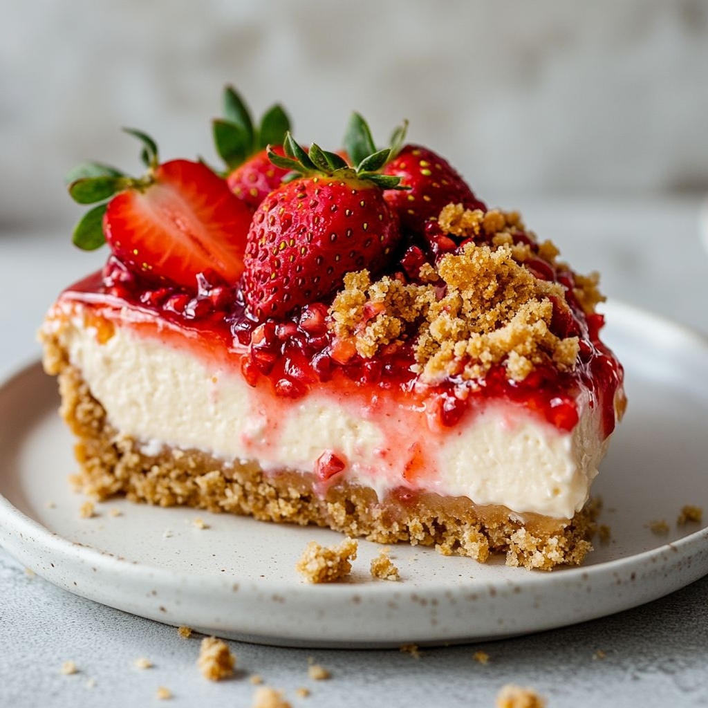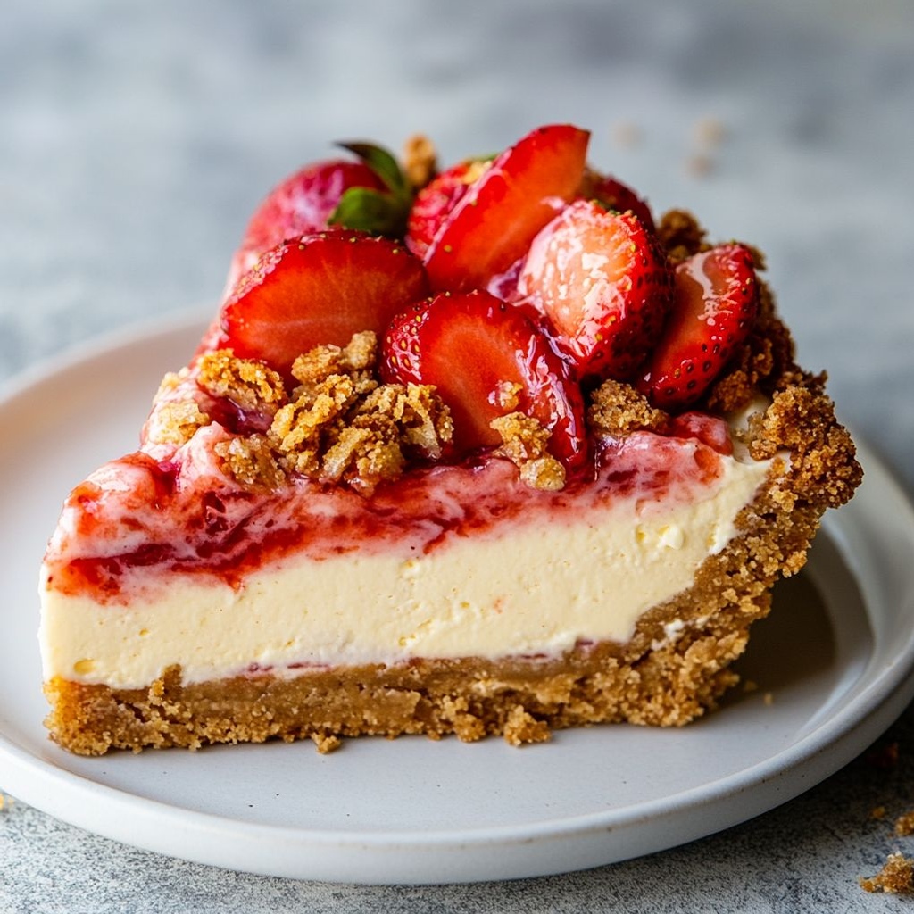 • Serve slices chilled or at room temperature, optionally garnished with fresh strawberry slices for color and aroma; enjoy the contrast between the creamy filling, bright strawberry swirl, and crunchy topping.