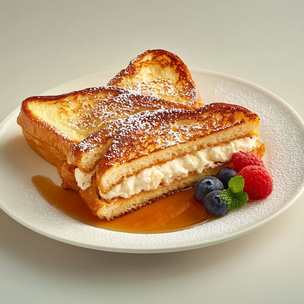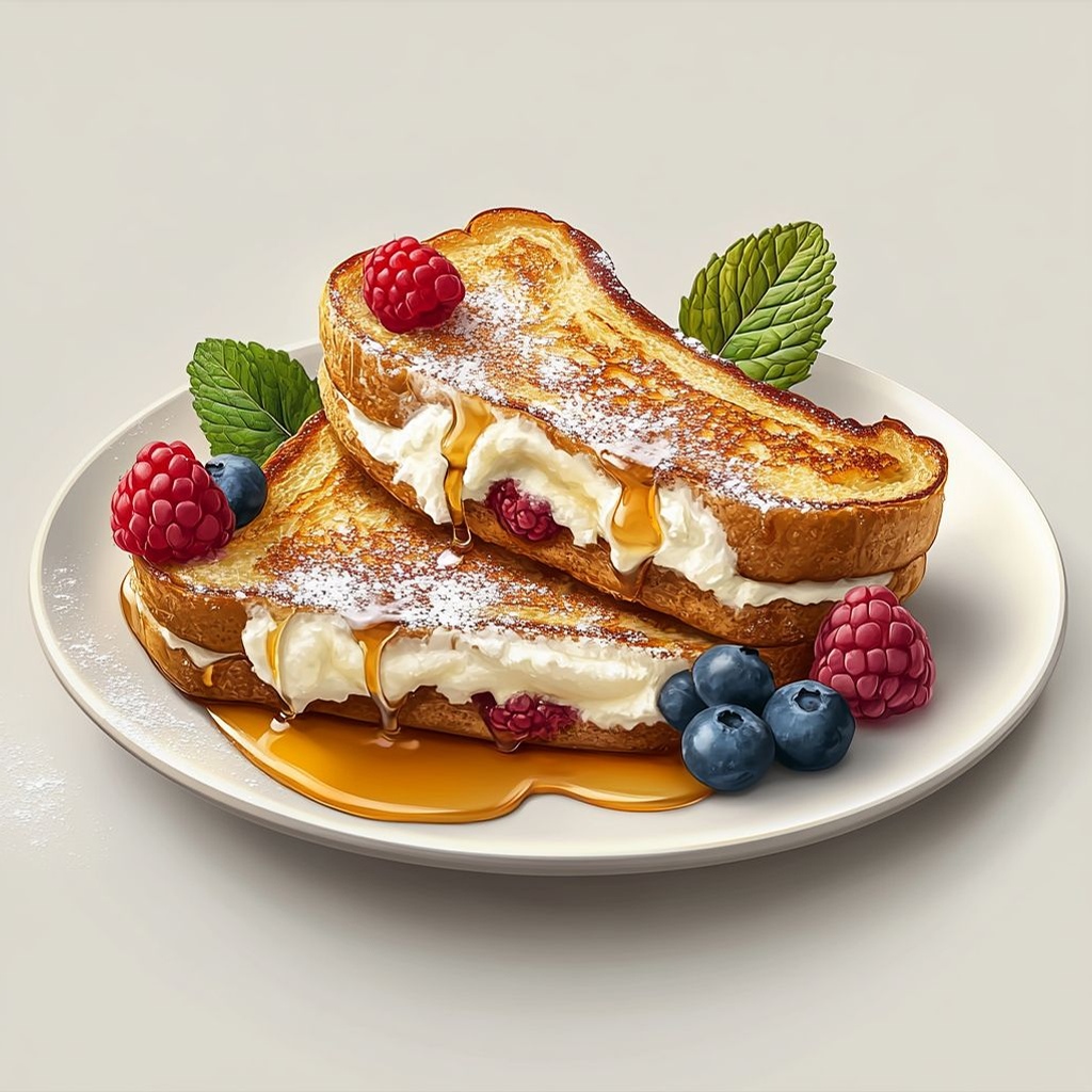 → A gentle warm hold preserves crispness and heat distribution without sogginess from stacked pieces. - To serve, transfer the stuffed French toast to plates and drizzle with warm pure maple syrup; dust with a light coat of powdered sugar and garnish with fresh berries or sliced fruit; offer whipped cream on the side if desired to add a creamy contrast.