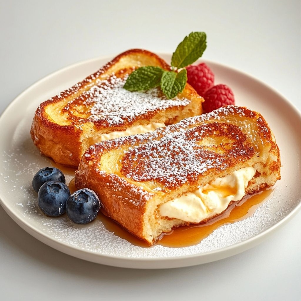 Stuffed Cream Cheese French Toast is a breakfast treat where thick slices of bread are spread with a creamy cream cheese filling, sandwiched together, then dipped in a cinnamon-vanilla egg custard and cooked until golden. The result is a tender interior with a creamy center and a crisp, caramelized exterior. It’s typically served with maple syrup and fresh fruit.
