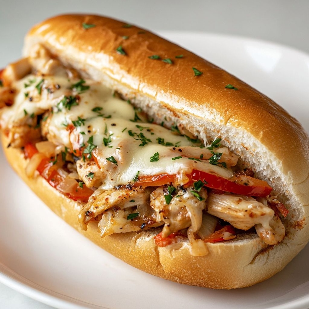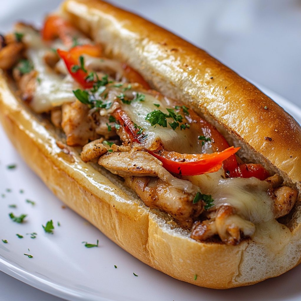 A quick handheld sandwich inspired by a Philly cheesesteak, made with seasoned chicken, sautéed onions and garlic, and finished with Parmesan (plus optional mozzarella) on a toasted roll.