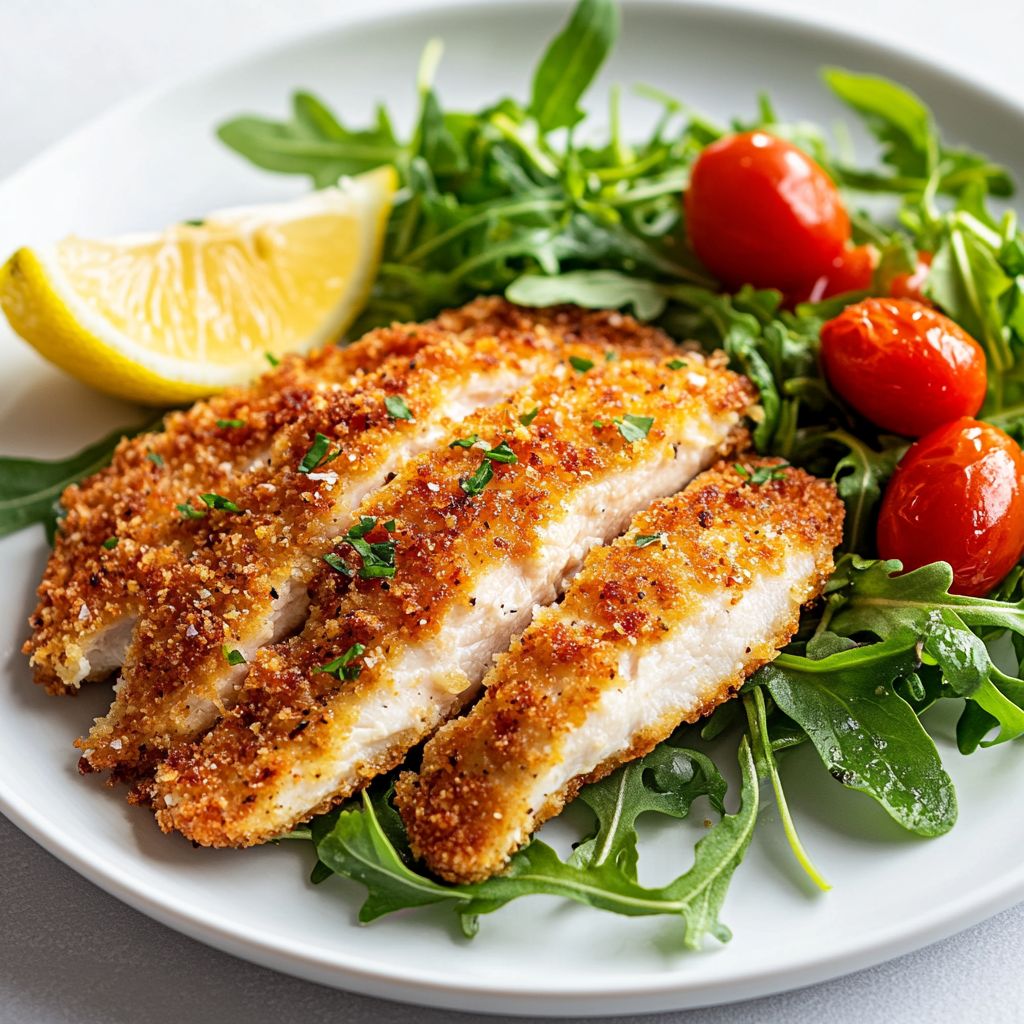 Gluten-free: use a gluten-free breadcrumb or crushed almonds for texture. Dairy-free: omit cheese in the crust or substitute with a dairy-free cheese option, while maintaining the crisp crust with an extra pinch of salt and lemon zest. Low-carb: use an almond meal-based crust; skip breading altogether and finish with a lemon–garlic pan sauce for moisture and flavor. Vegan: substitute chicken with cauliflower or king oyster mushrooms in the same breading and cooking process, adjusting the crust to be oven-crisp instead of pan-fried if needed.