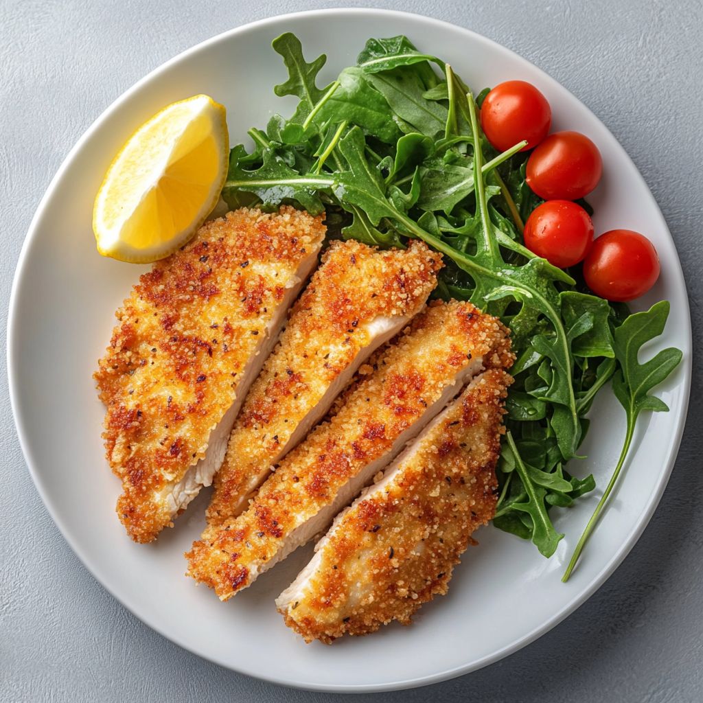 Italian Chicken Milanese is a classic Milanese dish featuring thin, breaded chicken cutlets that are pan-fried in olive oil or butter until golden and crisp. It’s typically served with a squeeze of lemon and a simple salad or arugula on the side.