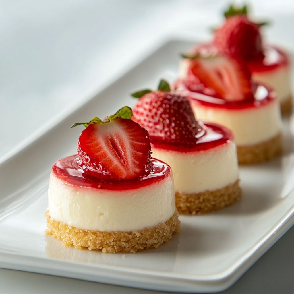 È una versione monoporzione di cheesecake cremosa, realizzata in piccoli bocconcini facili da prendere. Ha una base di biscotti croccanti, una crema di formaggio morbido e una guarnizione di fragole fresche, perfetta come dessert estivo o finger food.