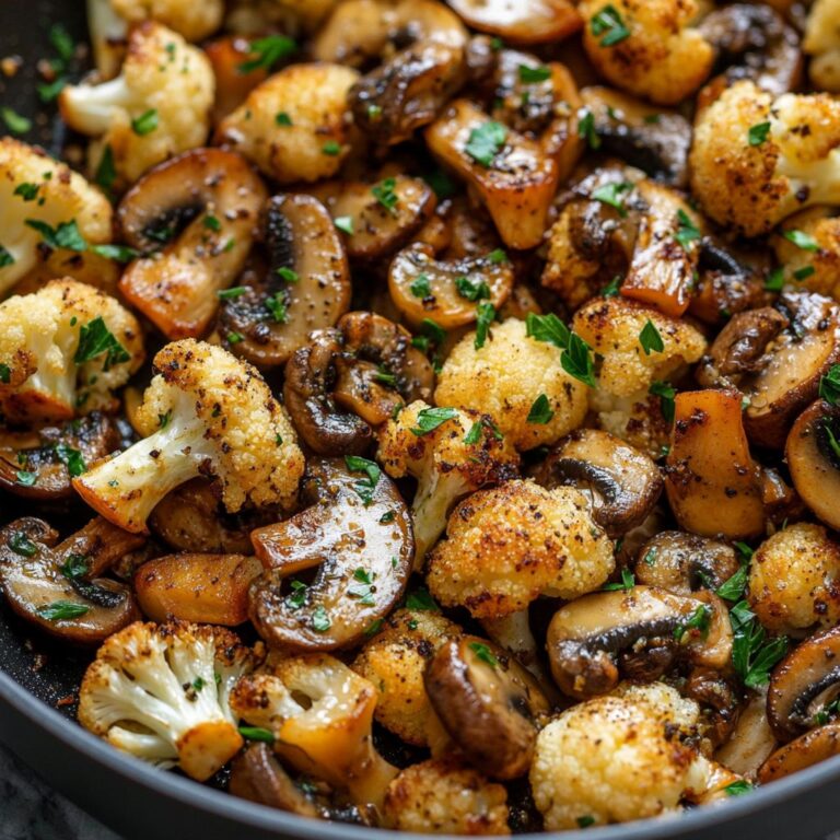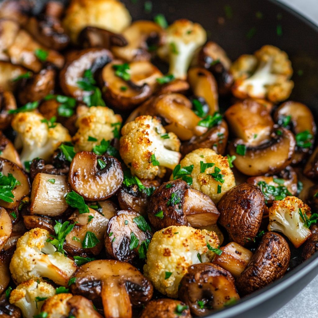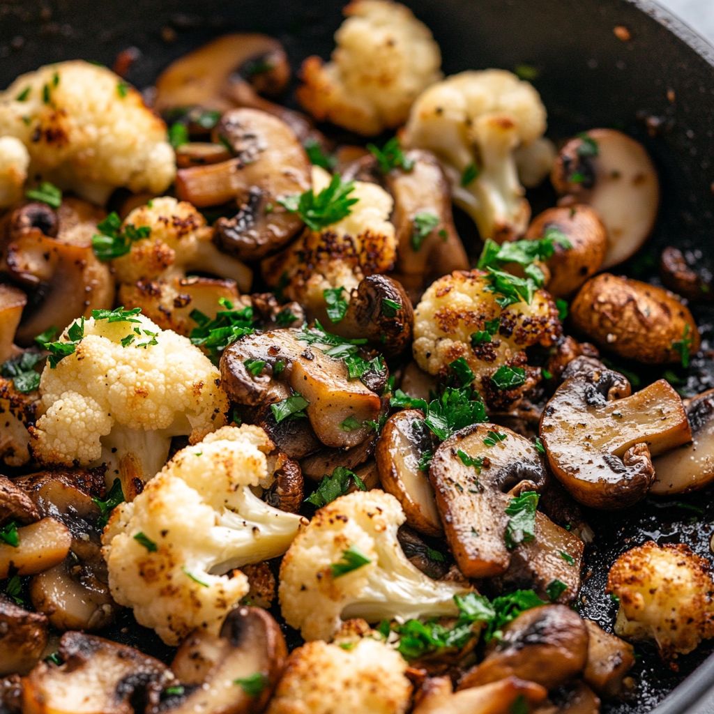 Feel free to experiment with the seasonings; a pinch of crushed red pepper flakes can add a nice kick if you enjoy heat. The addition of fresh parsley not only brightens the dish visually but also adds a fresh flavor which complements the richness of the mushrooms and cauliflower. Serve this skillet dish warm as a side or as a main course, perhaps alongside a grain like quinoa for a filling meal.