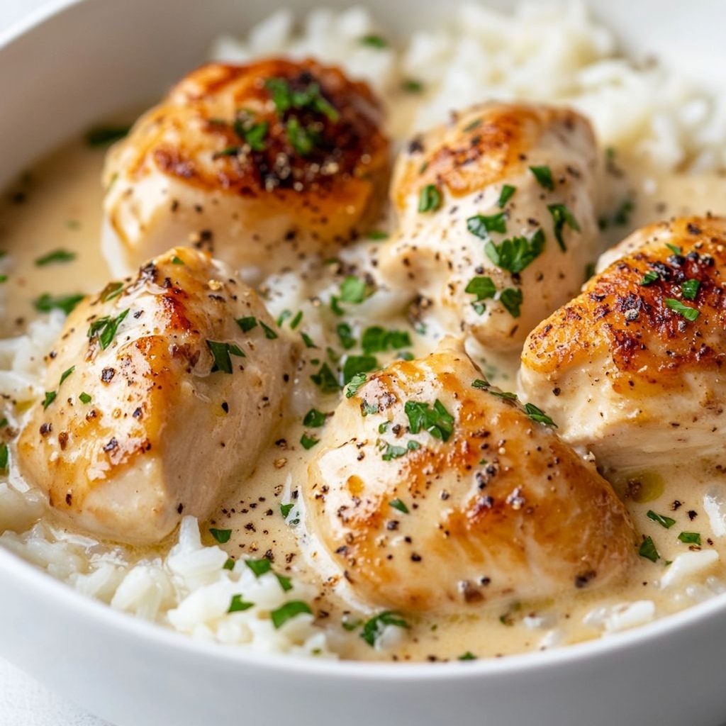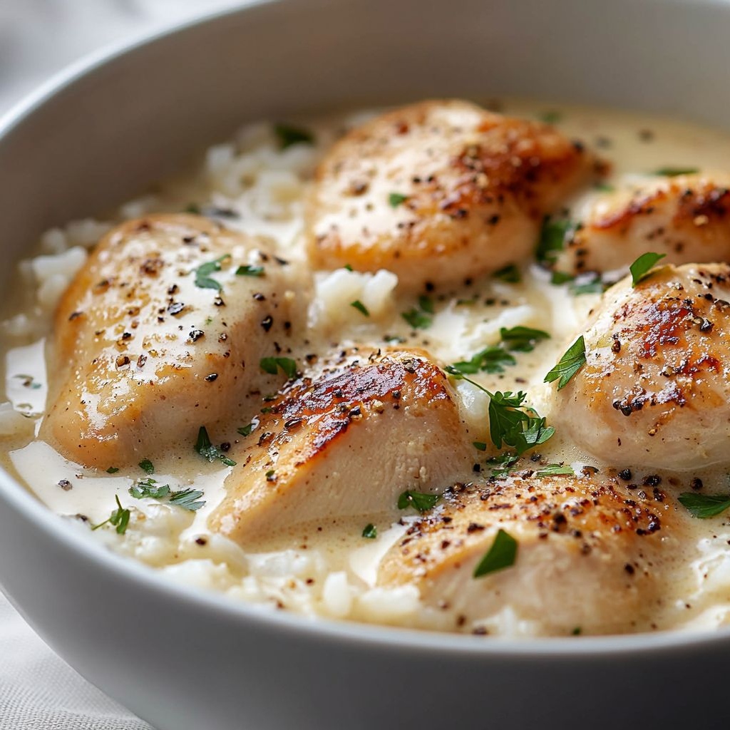 These Pollo cremoso con arroz notes describe a comforting, one-pan-style dish with juicy seared chicken, fluffy rice cooked in hot broth, and a silky cream sauce enriched with Parmesan. For best results, pat the chicken dry and season lightly before searing to develop color, then rest while you finish the sauce; rinse the rice until the water runs clear to remove surface starch and cook it in hot broth to infuse flavor and keep the grains separate. In the crema, combine heavy cream, whole milk, and Parmesan, and thicken with a little all‑purpose flour or cornstarch—if using flour whisk it with a splash of hot sauce to form a slurry, or use a cold-water cornstarch slurry to prevent lumps; optional cream cheese adds extra silkiness, and a kiss of smoked paprika provides warmth and color. Finish with a bright lemon juice on the end to counterbalance richness. Sauté aromatics—onion first, then garlic—to build depth, and if you like earthiness, add mushrooms and thawed peas toward the end to preserve texture and color. Season thoughtfully with kosher salt and black pepper, and if you want a subtle herbal note, a pinch of dried thyme or oregano works best sparingly so it doesn’t overwhelm the creamy sauce. Finish with butter for gloss, scatter fresh parsley and extra Parmesan just before serving, and offer lemon wedges on the side for a fresh finish. For gluten-free preparation, use cornstarch or gluten-free all-purpose flour as the thickener and ensure the broth is gluten-free; leftovers refrigerate well for a few days and reheat gently with a splash of broth or milk to loosen the sauce.
