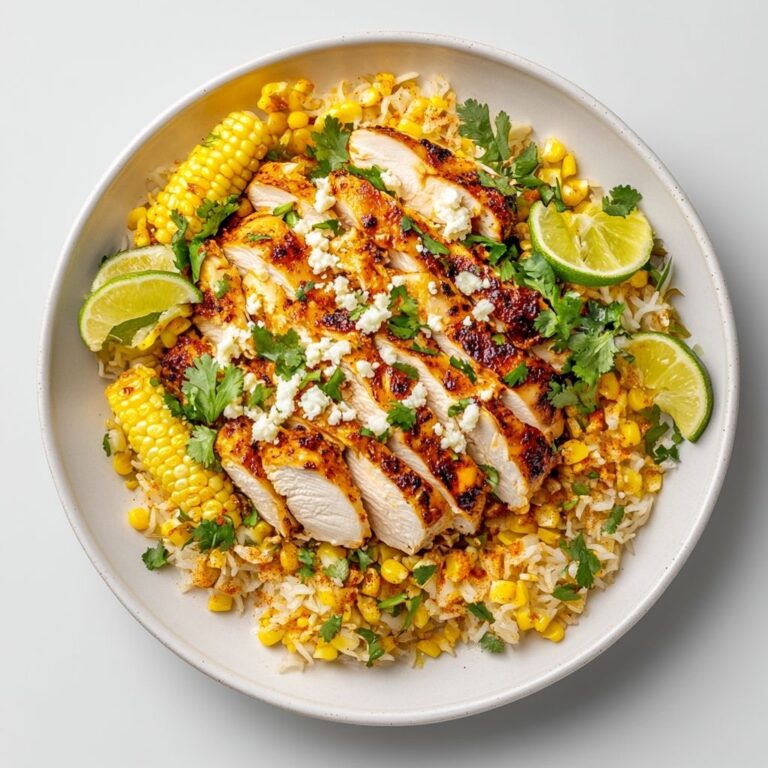 This dish is built around a harmonious quartet of flavors. The chicken provides a savory, umami-backed foundation—its natural richness tempered by roasting or searing, which adds a subtle caramelized glaze. The rice offers a gentle, comforting canvas—nutty and mildly sweet, absorbing the savory juices without becoming stodgy. The street corn brings a bright, vibrant sweetness, mingling with a touch of smokiness from the grill. A citrusy accent—typically from lime or lemon—brightens the profile, cutting through the richness and adding a refreshing lift. A dash of savory, tangy, or slightly creamy component ties everything together, giving a gentle depth that lingers on the palate after the last bite.